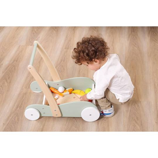 Hračka s jednoduchým designem je navíc vybavena velkými protiskluzovými koly a stabilní pevnou rukojetí. Velký úložný prostor umožňuje přepravu hraček různých velikostí a množství.
