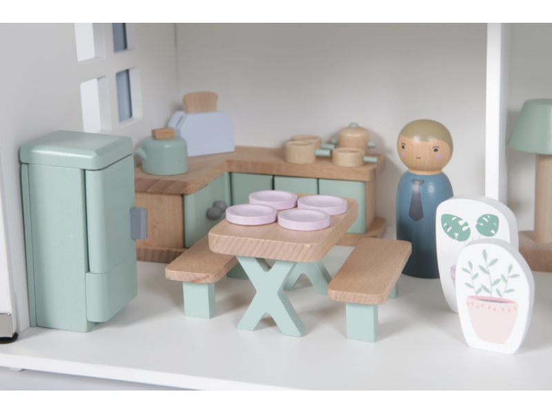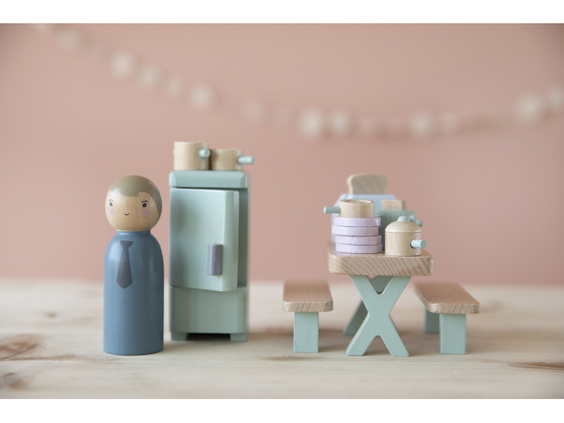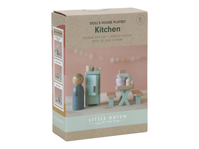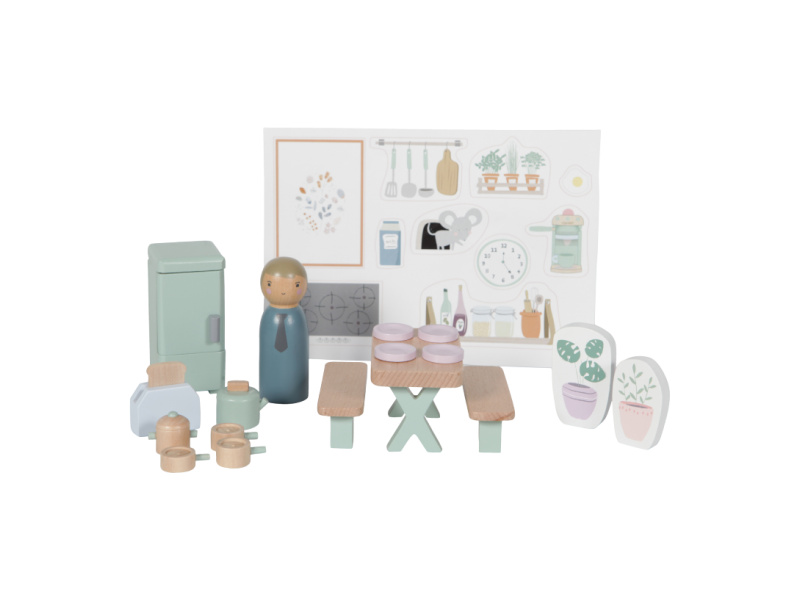 Sada s vybavením kuchyně v dřevěném provedení je vhodným doplňkem dřevěného domečku Little Dutch. Sada obsahuje stůl, dvě lavice, lednici, toastovač s toustem, čajovou konvici, 4 talíře, 4 hrnce, 2 květiny, figurku tatínka a sadu samolepek. Vhodné pro děti od 3 let.