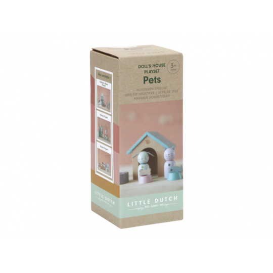 Sada s pejskem a kočičkou v dřevěném provedení je vhodný doplněk k dřevěnému domečku Little Dutch. Sada obsahuje pejska, kočičku, psí boudu, pelíšek pro kočičku, misku pro pejska a misku pro kočičku. Vhodné pro děti od 3 let.