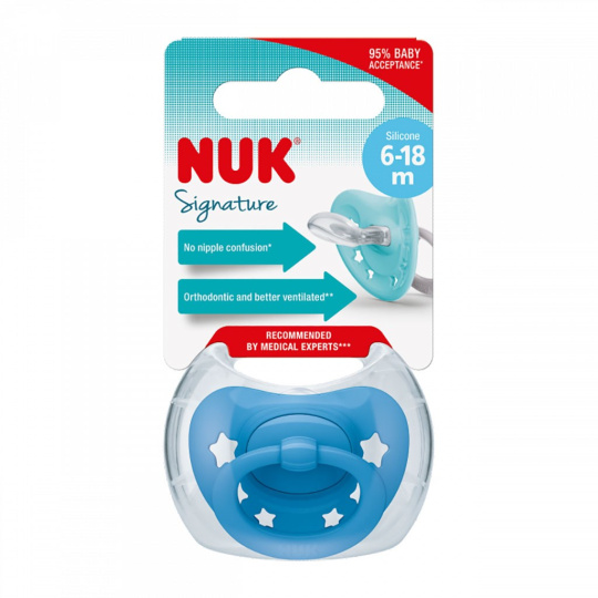 Kojenecký dudlík NUK Signature 6-18 měsíců. Ortodontický tvar podporuje vývoj celé ústní dutiny dítěte. Dudlík je vylepšený a má ještě plošší tvar. Je vyroben z vysoce kvalitního plastu a silikonového dudlíku. A nyní má tento široce oblíbený dudlík úžasný nový vzhled – oblíbený oblý tvar naústního štítu ve tvaru srdce a módní vylepšení roztomilého kroužku. Díky tomu bude malý obličejík vypadat ještě roztomileji. Každý nový dudlík NUK dodáváme v odolné, znovu použitelné krabičce, která dudlík udržuje čistý. Krabička je navíc vhodná pro hygienické čištění v mikrovlnné troubě. Náustní kryt a kroužek jsou vyrobeny z polypropylenu a neobsahují BPA. Velikost 2 (6-18 měsíců). Všechny NUK dudlíky jsou pravidelně testovány a sledovány nezávislými instituty.