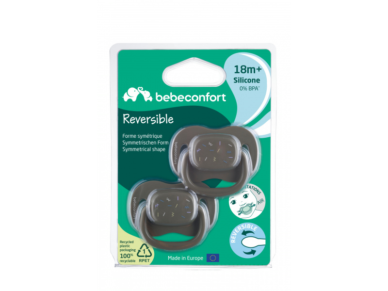 Šidítko se symetrickou savičkou z měkkého silikonu. Vnější část šidítka má otvory pro cirkulaci vzduchu, aby nedošlo k podráždění citlivé pokožky kolem úst. Balení obsahuje 2 kusy. Vhodné pro děti od 18 měsíců. Neobsahuje BPA.