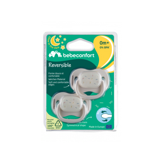 Šidítko se symetrickou savičkou z měkkého silikonu. Vnější část šidítka má otvory pro cirkulaci vzduchu, aby nedošlo k podráždění citlivé pokožky kolem úst. Šidítko ve tmě světélkuje, takže jej snadno najdete i v noci v postýlce. Balení obsahuje 2 kusy. Vhodné pro děti od narození. Neobsahuje BPA.
