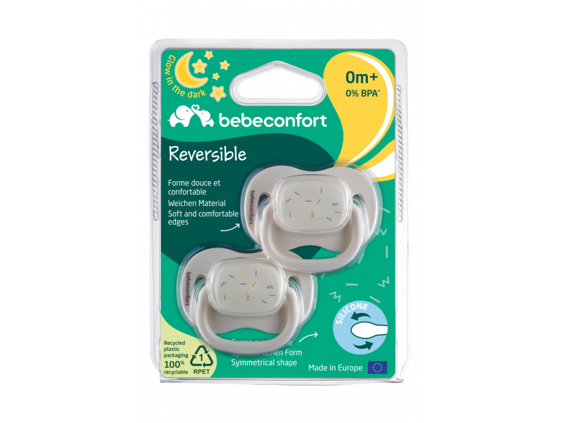 Šidítko se symetrickou savičkou z měkkého silikonu. Vnější část šidítka má otvory pro cirkulaci vzduchu, aby nedošlo k podráždění citlivé pokožky kolem úst. Šidítko ve tmě světélkuje, takže jej snadno najdete i v noci v postýlce. Balení obsahuje 2 kusy. Vhodné pro děti od narození. Neobsahuje BPA.