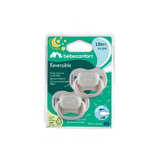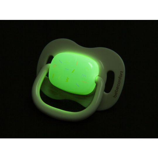 Šidítko se symetrickou savičkou z měkkého silikonu. Vnější část šidítka má otvory pro cirkulaci vzduchu, aby nedošlo k podráždění citlivé pokožky kolem úst. Šidítko ve tmě světélkuje, takže jej snadno najdete i v noci v postýlce. Balení obsahuje 2 kusy. Vhodné pro děti od 18 měsíců. Neobsahuje BPA.