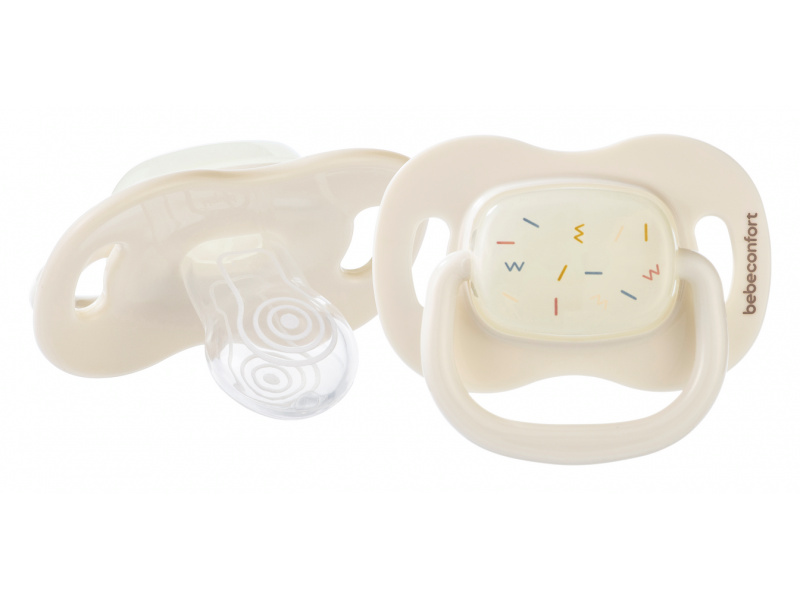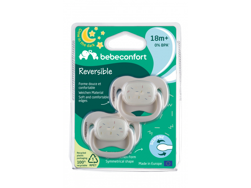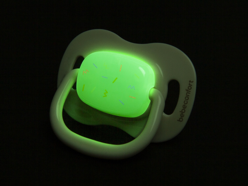 Šidítko se symetrickou savičkou z měkkého silikonu. Vnější část šidítka má otvory pro cirkulaci vzduchu, aby nedošlo k podráždění citlivé pokožky kolem úst. Šidítko ve tmě světélkuje, takže jej snadno najdete i v noci v postýlce. Balení obsahuje 2 kusy. Vhodné pro děti od 18 měsíců. Neobsahuje BPA.