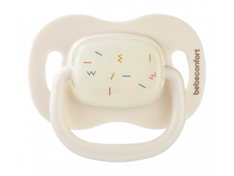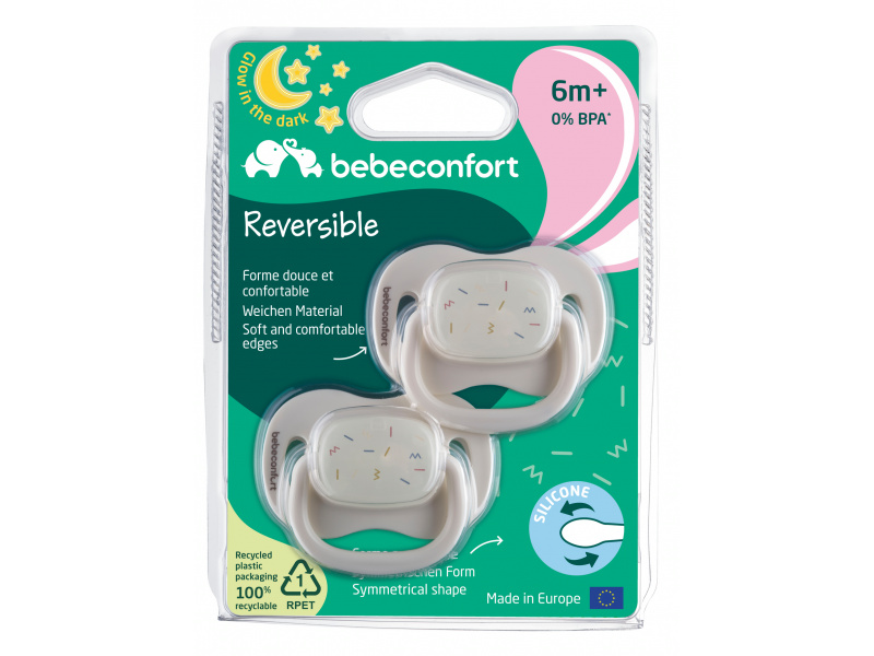 Šidítko se symetrickou savičkou z měkkého silikonu. Vnější část šidítka má otvory pro cirkulaci vzduchu, aby nedošlo k podráždění citlivé pokožky kolem úst. Šidítko ve tmě světélkuje, takže jej snadno najdete i v noci v postýlce. Balení obsahuje 2 kusy. Vhodné pro děti od 6 měsíců. Neobsahuje BPA.