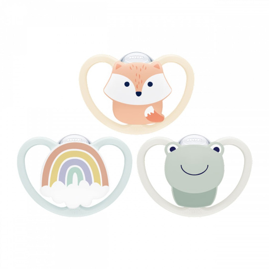 Kojenecký silikonový dudlík NUK Space 1/box 0-6 měsíců s krásným barevným obrázkem zvířátka. Nový dudlík Space s inovativním, moderním designem umožňuje jemné dětské pokožce dýchat. Speciálně určen pro citlivou pokožku dítěte a má robustní, znovu použitelný box pro uskladnění, přepravu a hygienickou sterilizaci v mikrovlnné troubě. Dudlík je vyroben z vysoce kvalitního plastu a silikonového dudlíku. Výhodou silikonu je to, že  je bez zápachu a lehce se čistí. Neobsahuje BPA. Všechny NUK dudlíky jsou pravidelně testovány a sledovány nezávislými instituty.