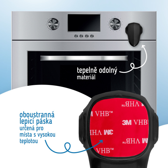 Díky speciální otočné konstrukci lze naše zámky na dvířka trouby instalovat téměř na libovolné místo a správně tak zablokovat otevírání dvířek. Navíc jej nemusíte pokaždé sundávat, abyste mohli troubu otevřít, stačí jen současně stisknout tlačítka po stranách a otočit zámek v libovolném směru. Materiál je odolný vůči vysokým teplotám a pro místa, kde se vyskytují vysoké teploty, je přiložena speciální lepicí páska.