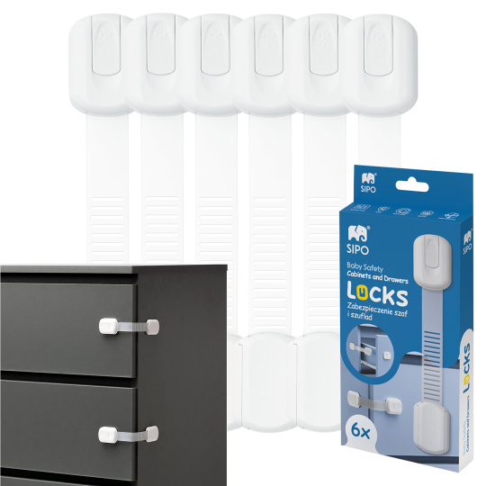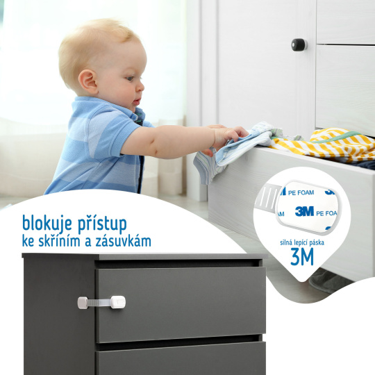 Sada 6ks SIPO dětských bezpečnostních zámků na skříňky a zásuvky s nastavitelnou délkou a systémem zavírání na západku, který umožní rychlý přístup dospělým, ale ochrání před otevření malými dětmi.