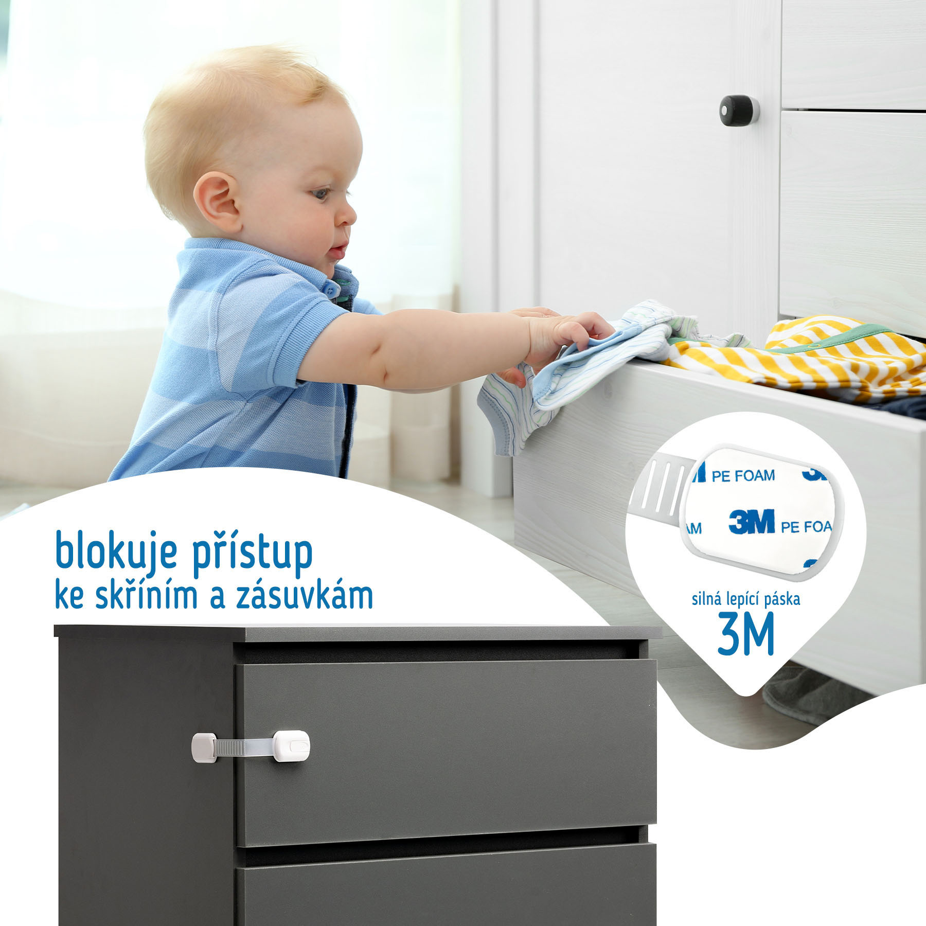 Sada 6ks SIPO dětských bezpečnostních zámků na skříňky a zásuvky s nastavitelnou délkou a systémem zavírání na západku, který umožní rychlý přístup dospělým, ale ochrání před otevření malými dětmi.