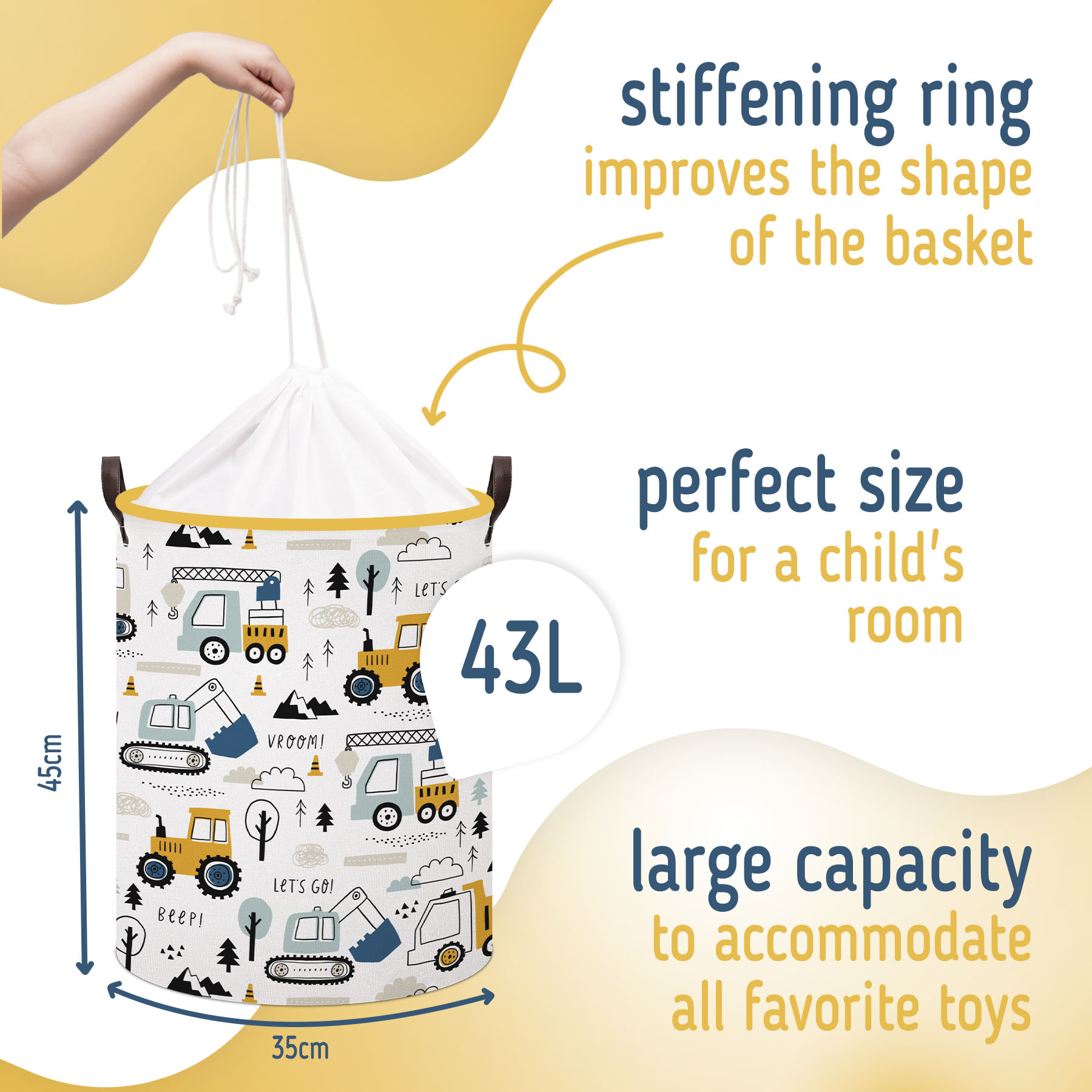 S jedním z našich praktických skládacích košů na hračky si úklid usnadníte jako nikdy předtím. S neuvěřitelným objemem až 43 litrů může mít každá hračka a milovaný plyšák své vlastní vyhrazené místo, kde může být uložen všechen nepořádek z podlahy! Naše koše jsou vysoce funkční a díky veselému designu slouží také jako atraktivní dekorativní předměty, které možná povzbudí i ty nejmenší, aby se zapojili a byli hrdí na to, že mají své věci uspořádané.