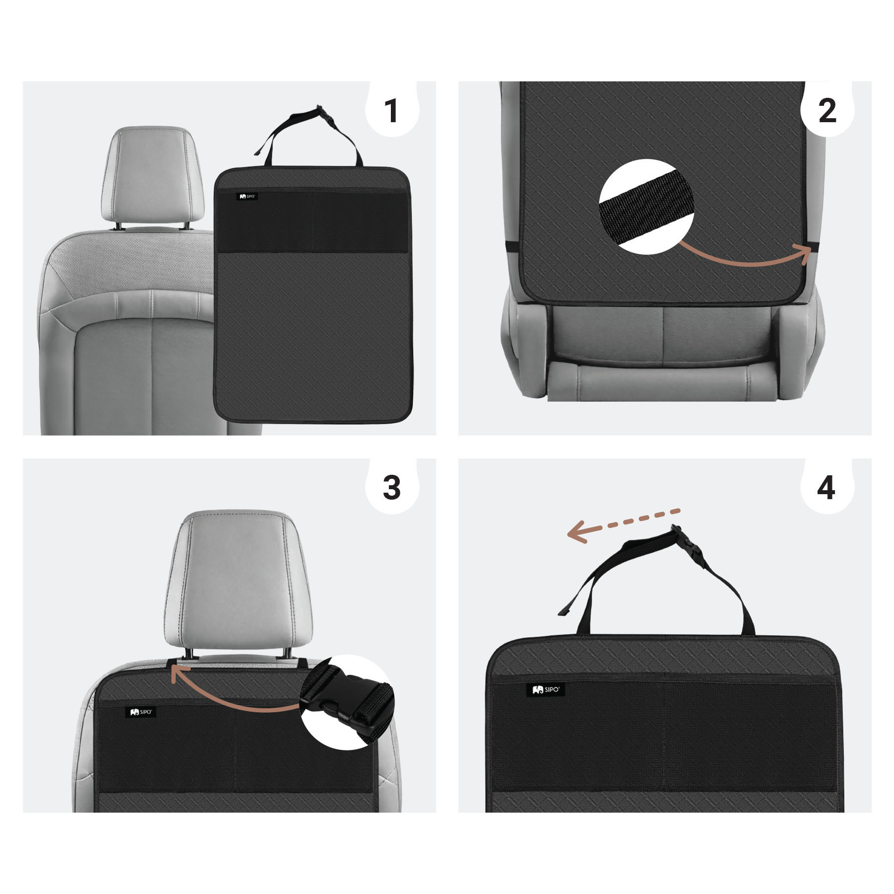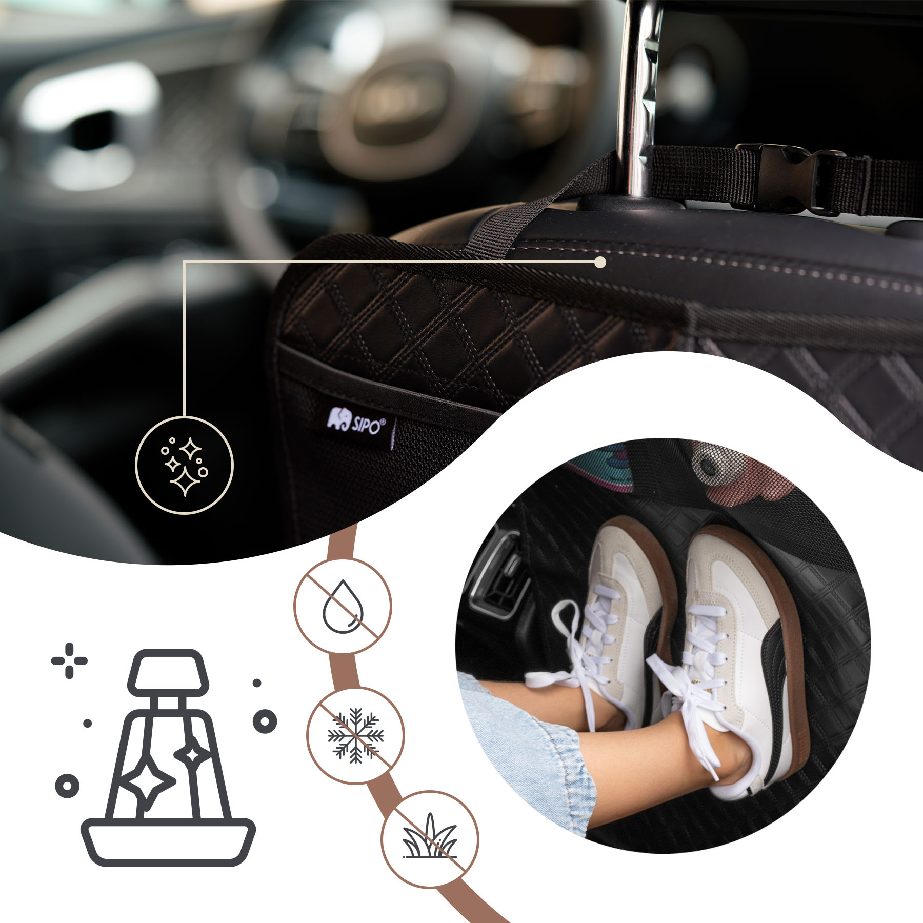 Voděodolná ochrana sedadla SIPO je praktickým řešením pro ochranu zadní části sedačky vozidla, které ocení zejména rodiče cestující s dětmi. Je vyrobena z odolného voděodolného materiálu a poskytuje spolehlivou ochranu před zablácenými botami, rozlitými tekutinami a každodenním opotřebením. Je také vybavena dvěma síťovanými kapsami pro uložení nezbytných věcí, jako jsou nápoje, hračky nebo kapesníky, které tak máte vždy po ruce. Díky systému rychlé instalace s nastavitelnými popruhy s přezkami zůstává ochrana bezpečně na svém místě i během dlouhých cest.