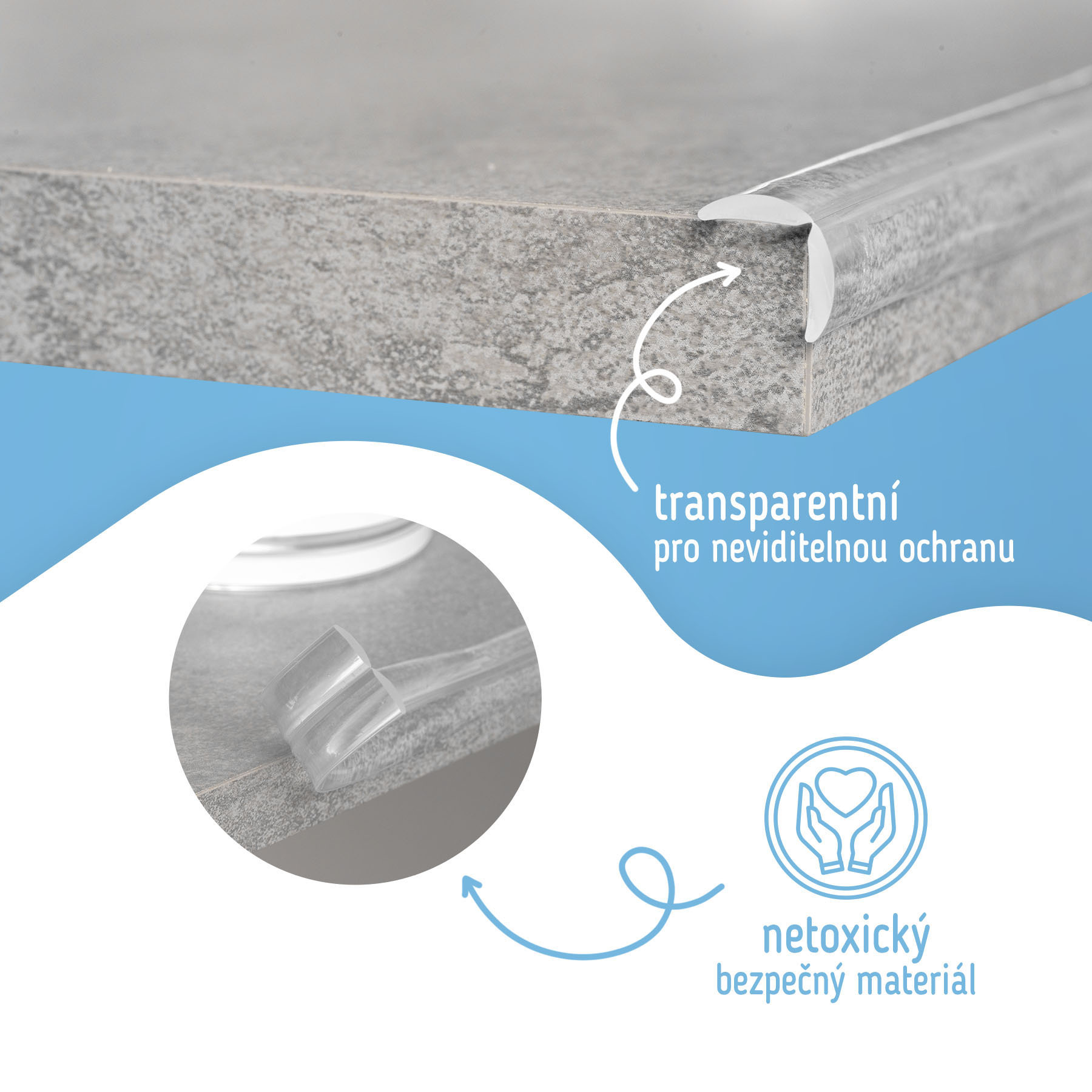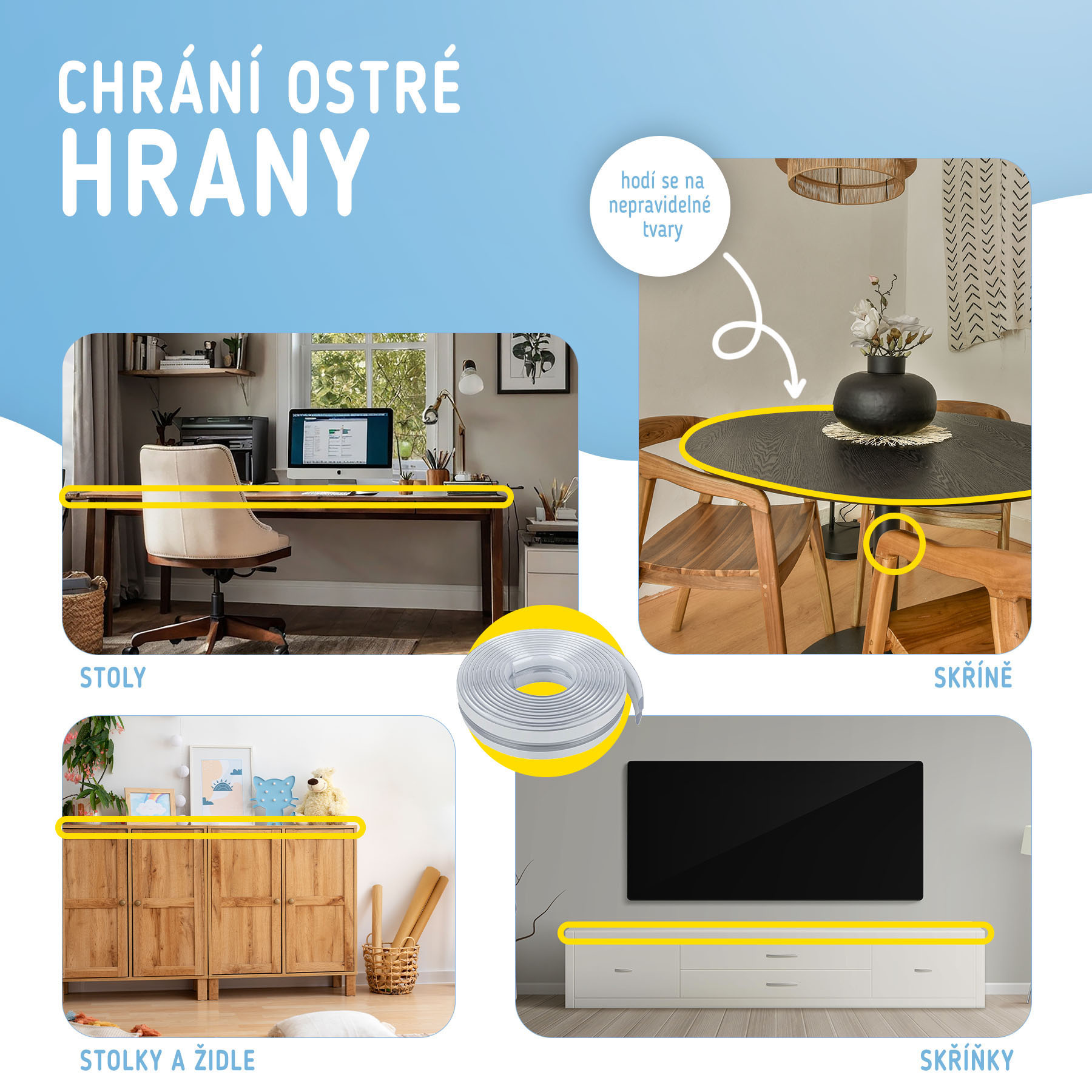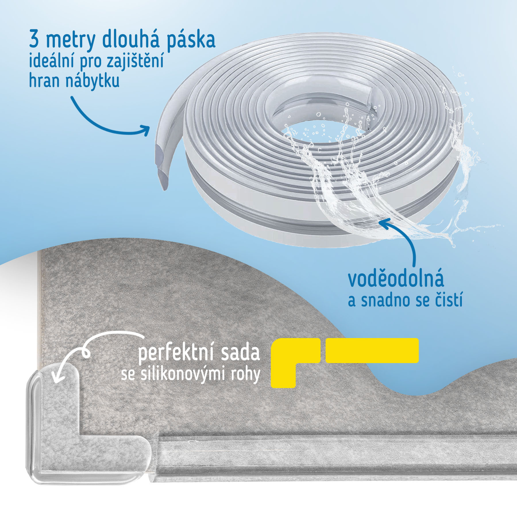 Měkká a pružná páska na hrany a rohy nábytku, stolů, skříní, schodů a dalších předmětů efektivně chrání vaše děti v případě nárazu. Pásku lze stříhat tak, aby dokonale přiléhala k hranám stolu, nebo si můžete zakoupit hotové rohy.