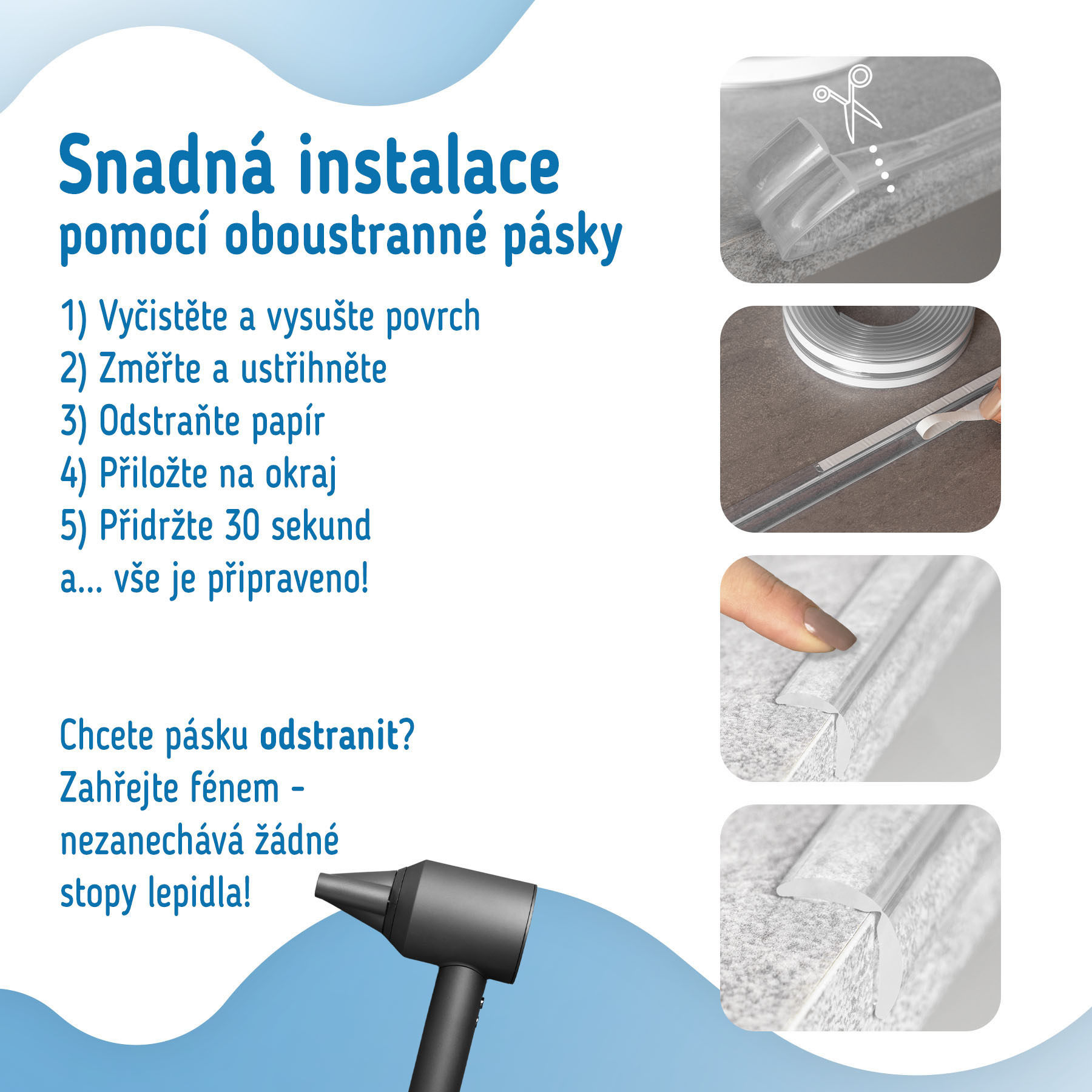 3. Před užitím nechte pásku dobře přilnout k povrchu nábytku - přibližně 24 hodin.