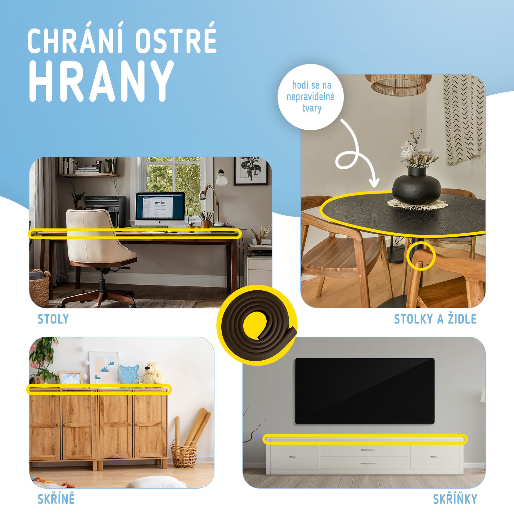 URČENÍ VÝROBKU: Ochranná páska je široce používaný bezpečnostní prvek díky materiálu a měkkosti. Lze ji použít k ochraně desek stolů, skříní, schodů a všech dalších prvků, které mají ostré hrany a mohly by tak představovat bezpečnostní riziko pro vaše děti.