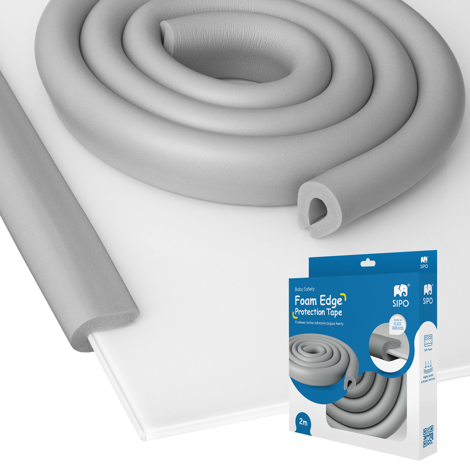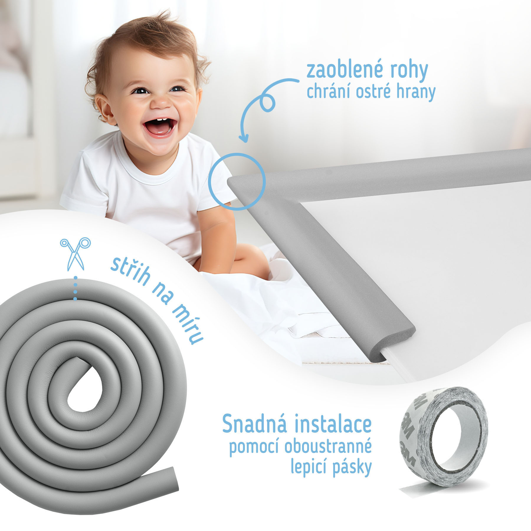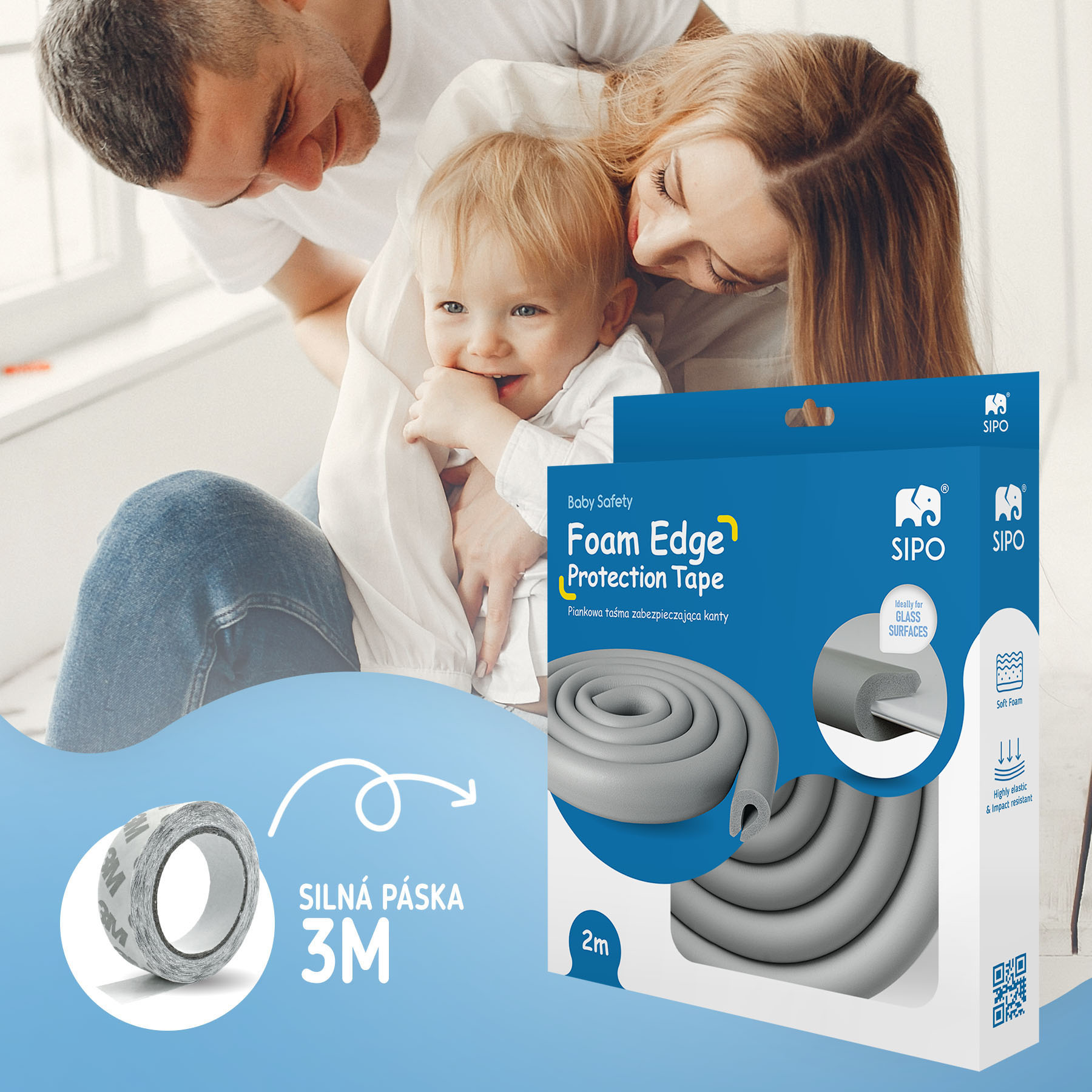 Pěnová ochranná páska Sipo na ostré hrany a rohy (ideální pro skleněný materiál), které by mohly způsobit zranění dítěte v případě kontaktu.