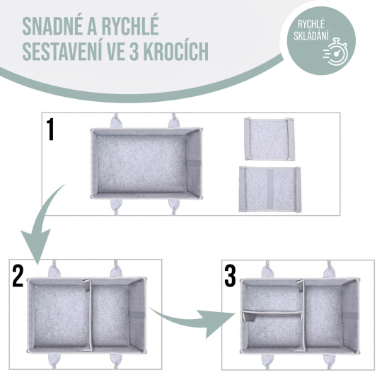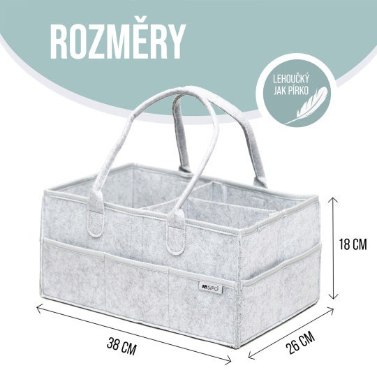 Hledáte organizér na plenky, který bude nejen funkčním ale k tomu i stylovým doplňkem vaší domácnosti? Nadčasový ekologický filcový materiál je určitě tou správnou volbou. Ne bez důvodu jsme zvolili elegantní přírodní šedý odstín – který se vyznačuje mimořádnou univerzálností a k tomu vypadá skvěle v každé místnosti. Minimalistický design odkazuje na skandinávský design, který je v posledních letech módní a vypadá elegantně na skřínce vedle postele, na přebalovacím pultu nebo na komodě.