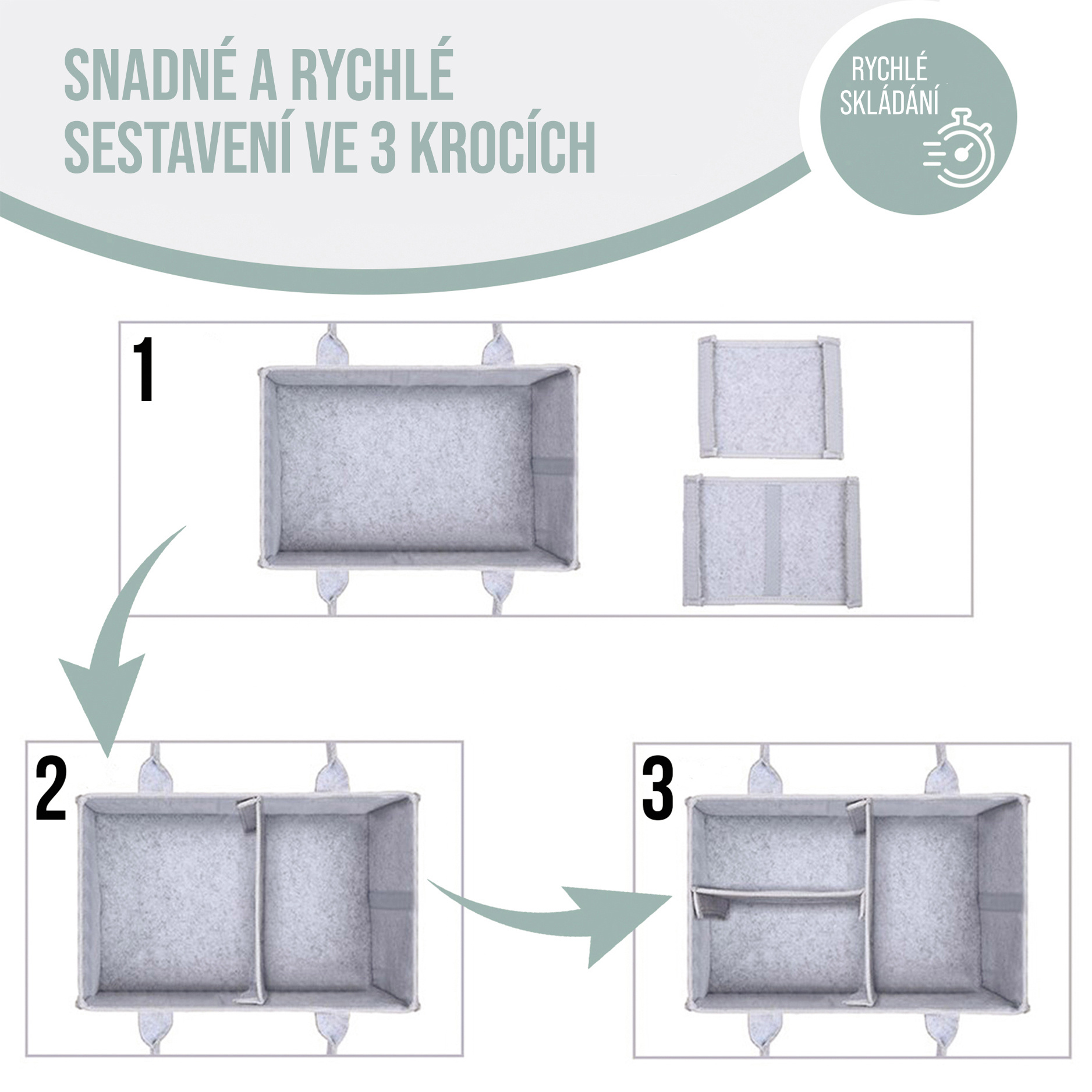 Díky svému designu a pohodlným rukojetím na přenášení si můžete vzít svůj organizér všude s sebou, kde jej bude třeba: do auta, na návštěvu k přátelům, na dovolenou i k babičce. Díky tomu budete mít vždy po ruce všechny nejnutnější doplňky a hračky. Navíc do malých bočních kapes snadno uschováte i své drobnosti, například peněženku, klíče nebo telefon.