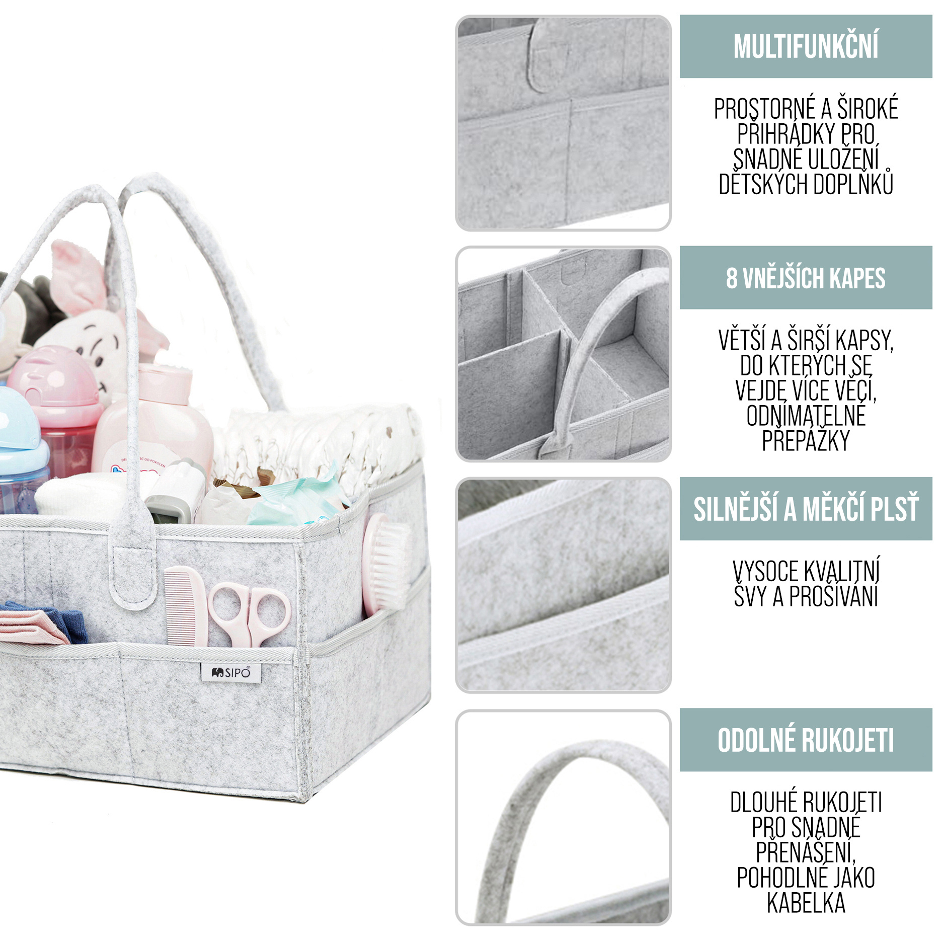 Dobře víme, že v případě výrobků vytvořených s ohledem na mladé maminky záleží nejen na funkčnosti, ale také na kvalitě použitých materiálů. Proto je organizér na pleny Sipo XL vyroben ze 100% ekologické a pro děti bezpečné plsti. Navíc jsme každý okraj organizéru zajistili ochrannou stuhou, která zároveň slouží jako dekorativní prvek. Díky speciální konstrukci je organizér Sipo bezpečný a zároveň zaručuje bezproblémové a dlouhodobé používání za všech podmínek.