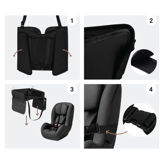 Umístěte stolek na klín dítěte, když sedí v autosedačce nebo na podsedáku. Poté provlečte bezpečnostní popruh kolem zadní části sedadla a zapněte sponu. Upravte popruh tak, aby byl stolek stabilní, ale neomezoval pohyb dítěte. Po použití rozepněte popruh a stolek složte do kompaktní podoby.