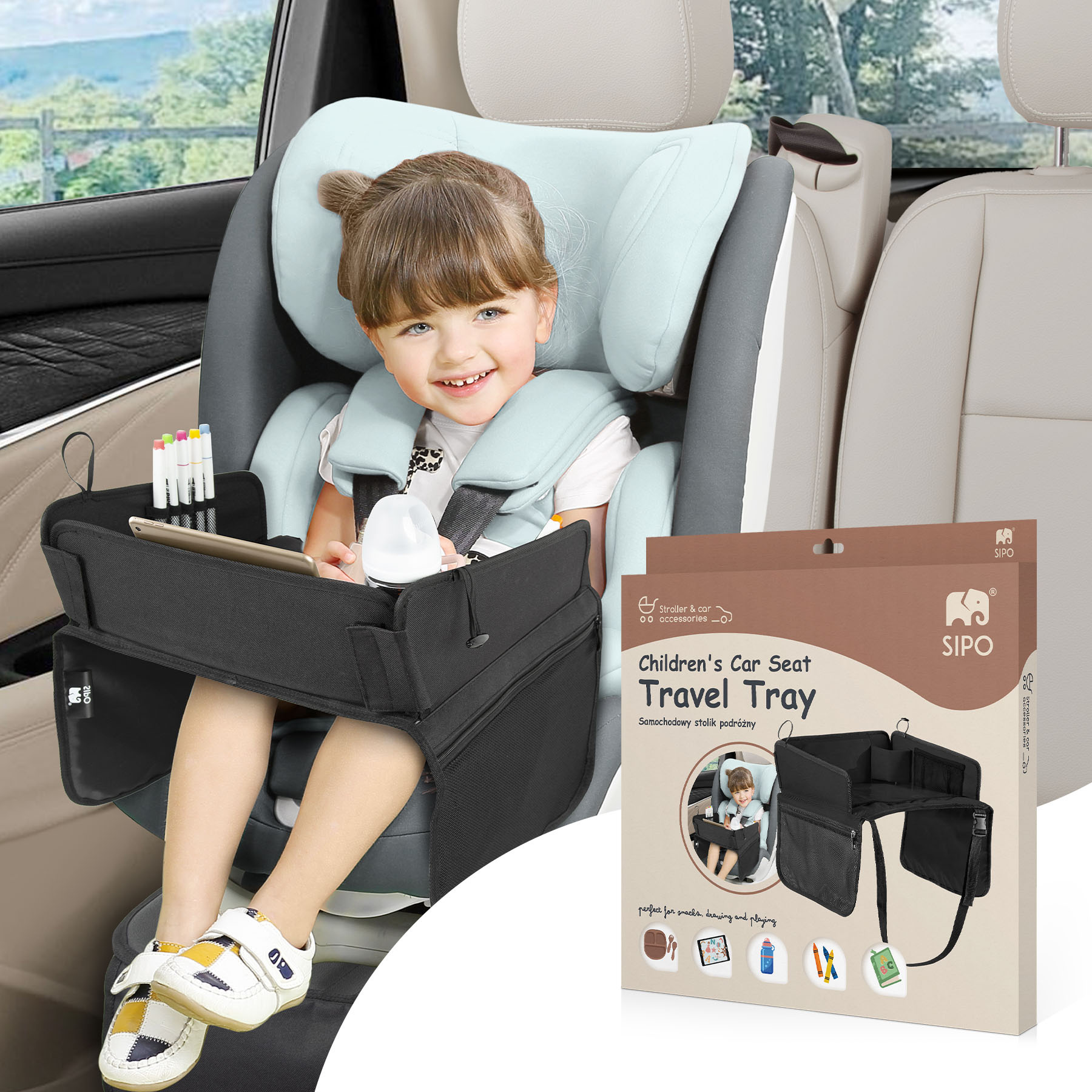 Stolek je vybaven průhlednou kapsou na tablet, do které se vejdou zařízení až do velikosti 11 palců, a umožňuje tak bezpečné a pohodlné sledování kreslených filmů během jízdy. Součástí je také držák na nápoje a praktické boční kapsy pro uložení školních potřeb, hraček, kapesníků nebo svačinek. Vysoké skládací boční stěny zabraňují vypadávání drobných předmětů a nastavitelné bezpečnostní popruhy zajišťují stabilitu stolku i na nerovných silnicích. Lehký, skládací a snadno přenosný – je to perfektní společník na cesty.