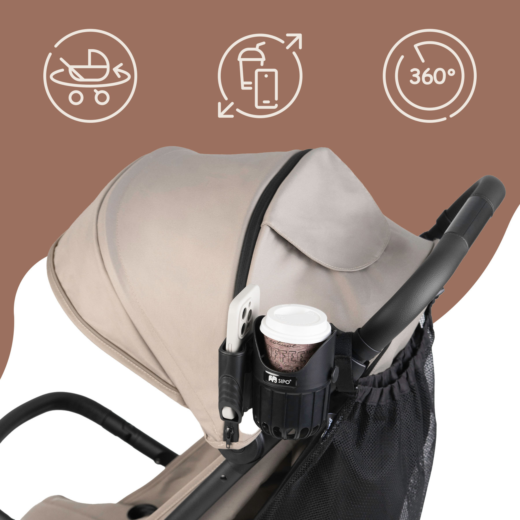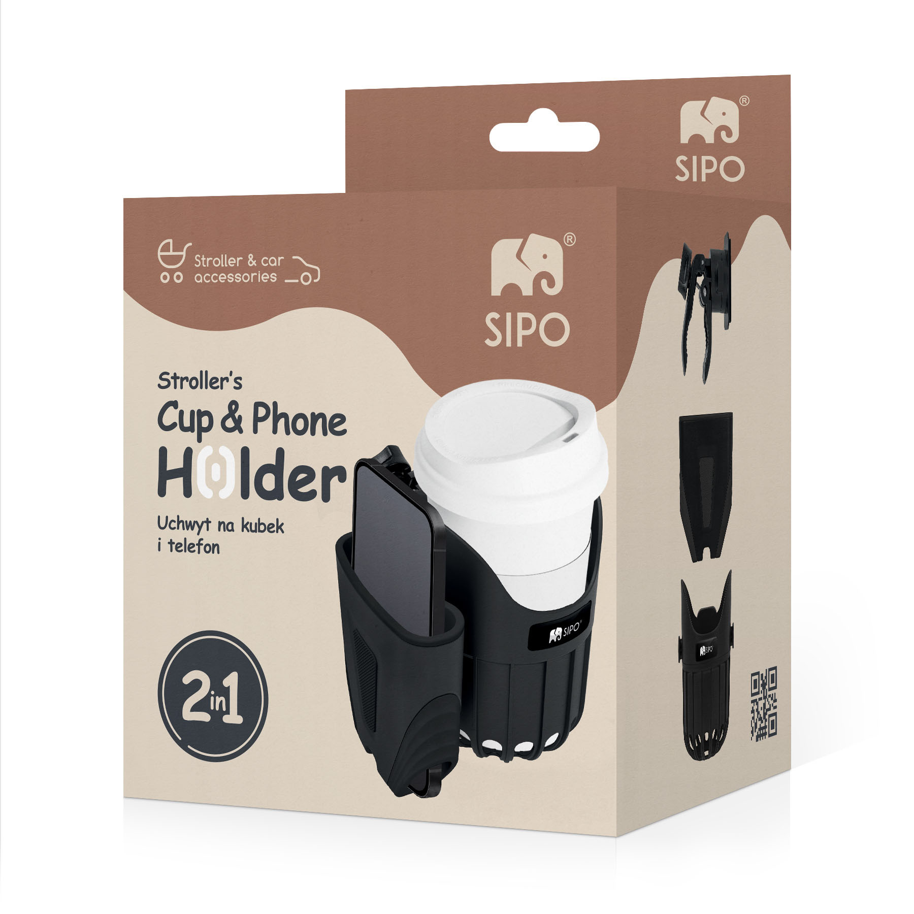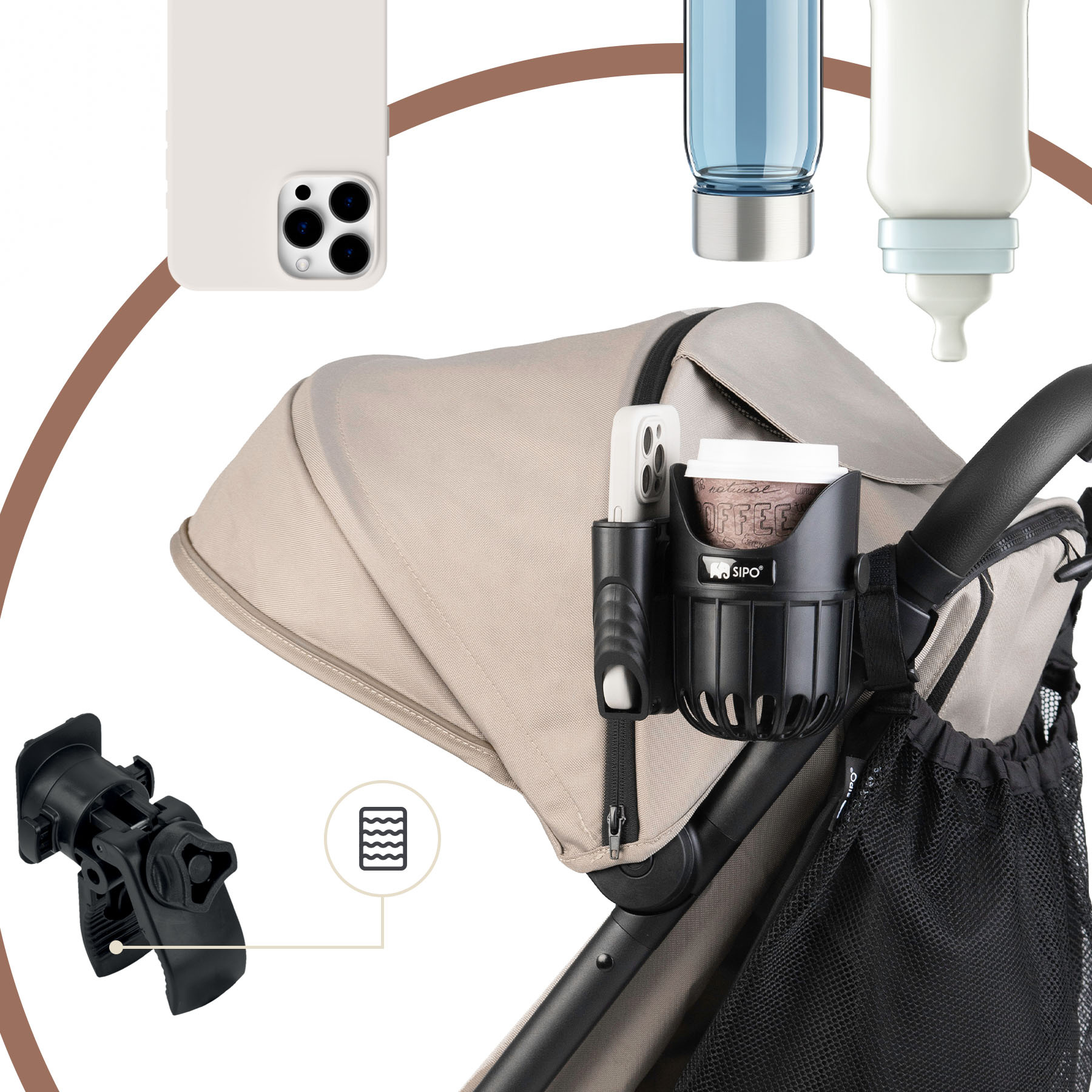 SIPO držák 2v1 je chytré příslušenství ke kočárku, které v sobě kombinuje funkčnost univerzálního držáku na nápoje a držáku na telefon. Je určen pro každodenní použití a je vhodný pro rodiče, kteří ocení pohodlí při procházkách se svými dětmi. Díky kompaktnímu designu a nastavitelnému upevňovacímu systému udrží držák bezpečně váš nápoj a přitom uchová váš telefon v bezpečí v samostatné přenosné kapse. Konstrukce umožňuje rychlý přístup pouze jednou rukou. Měkké silikonové vložky zabraňují poškrábání telefonu a láhve, zlepšují přilnavost a zajišťují bezpečné používání.