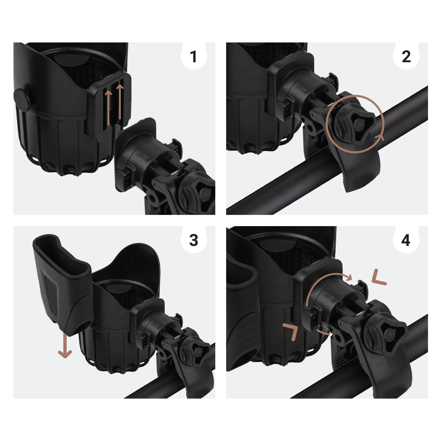 1. Nasuňte držák na nápoje na hlavní část úchytu na kočárek, až zapadne na místo.