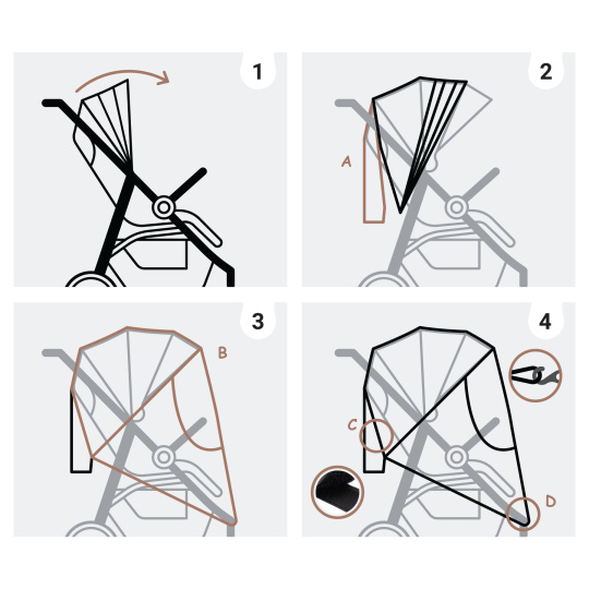 Vždy zkontrolujte správnou instalaci – všechny upevňovací prvky musí být pevně připevněny a pláštěnka by měla kočárek zcela zakrývat. Tvář dítěte by neměla být v přímém kontaktu s pláštěnkou. Nikdy neblokujte ventilační otvory – jsou nezbytné pro cirkulaci vzduchu, kterou je třeba pravidelně kontrolovat, zejména v teplejších dnech.