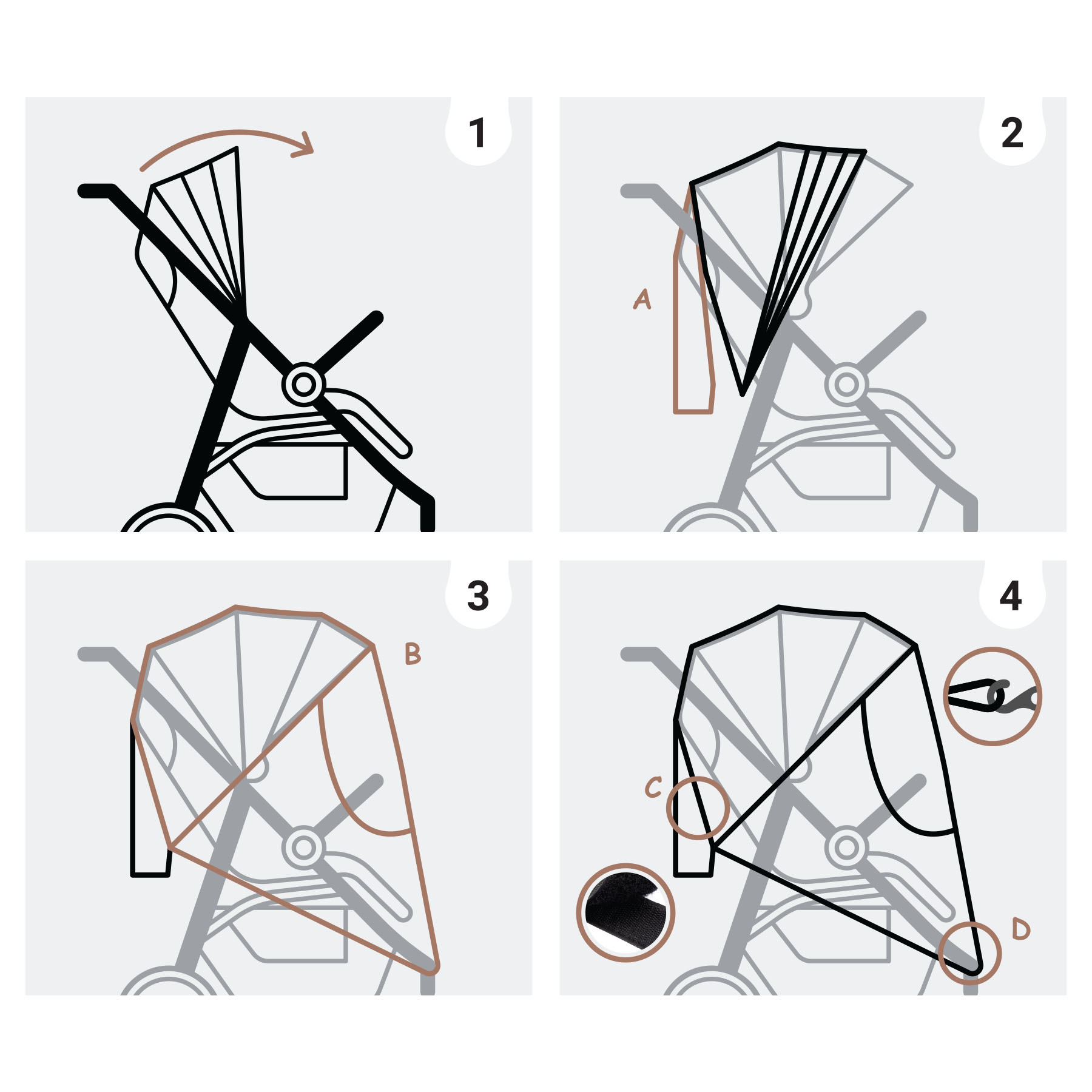 1. Rozložte kryt a položte jej na kočárek tak, aby jeho okraje byly zarovnány s rámem.