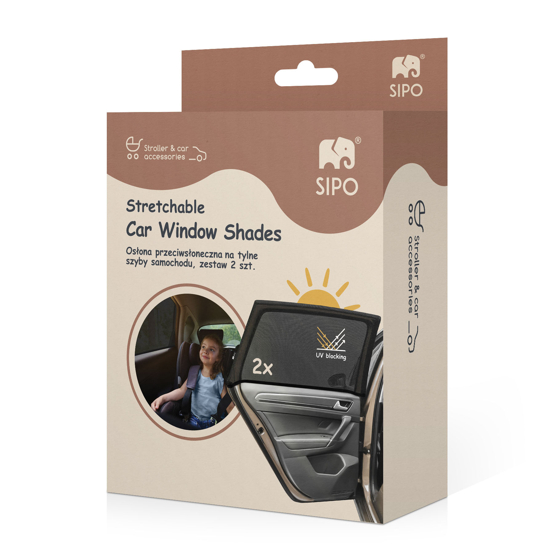 Praktická sada dvou síťových slunečních clon určených k zatemnění zadních bočních oken automobilu. Produkt byl vytvořen s ohledem na pohodlí dětí cestujících na zadních sedadlech a je vyroben z lehkého, ale odolného polyesterového materiálu. Účinně blokuje sluneční světlo tím, že zakrývá celou plochu okna, čímž snižuje hromadění tepla v interiéru a zvyšuje tepelný komfort v horkých dnech. Síťovina nejen chrání před slunečním zářením, ale také zvyšuje soukromí v automobilu, což je zvláště užitečné při činnostech, jako je kojení.