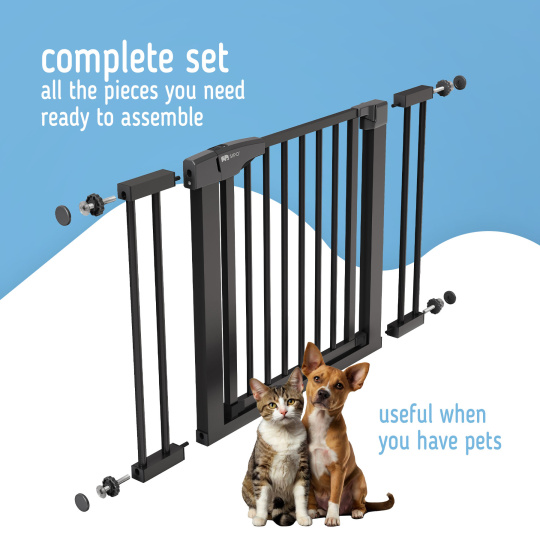 Sada skládající se z branky a kovového nástavce o šířce 7 nebo 14 cm je vhodná pro schody nebo dveře o šířce 75-103 cm. Díky nastavovacím šroubům ji můžete rychle a stabilně upevnit na místě.