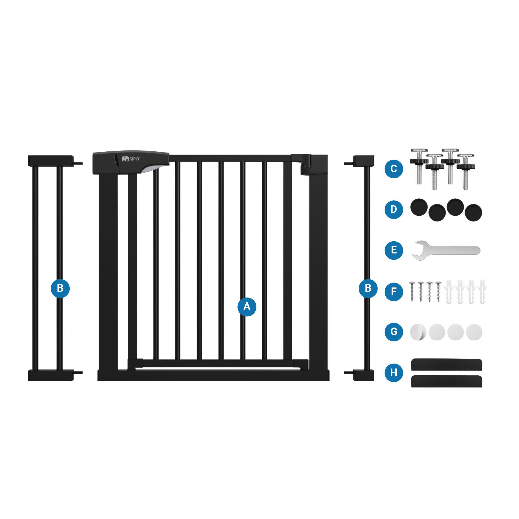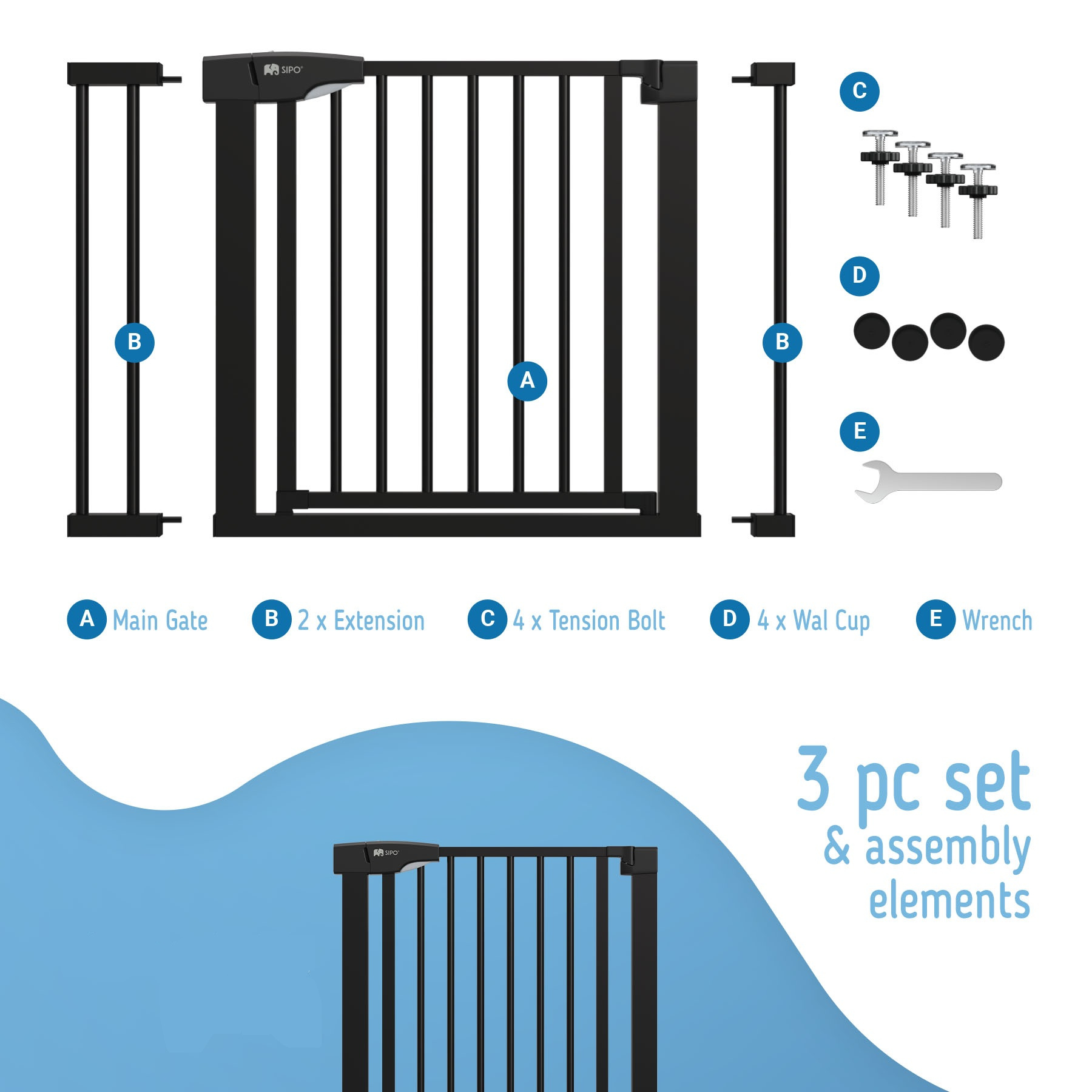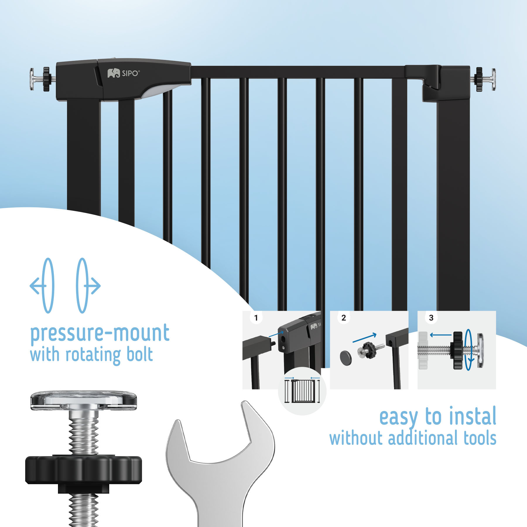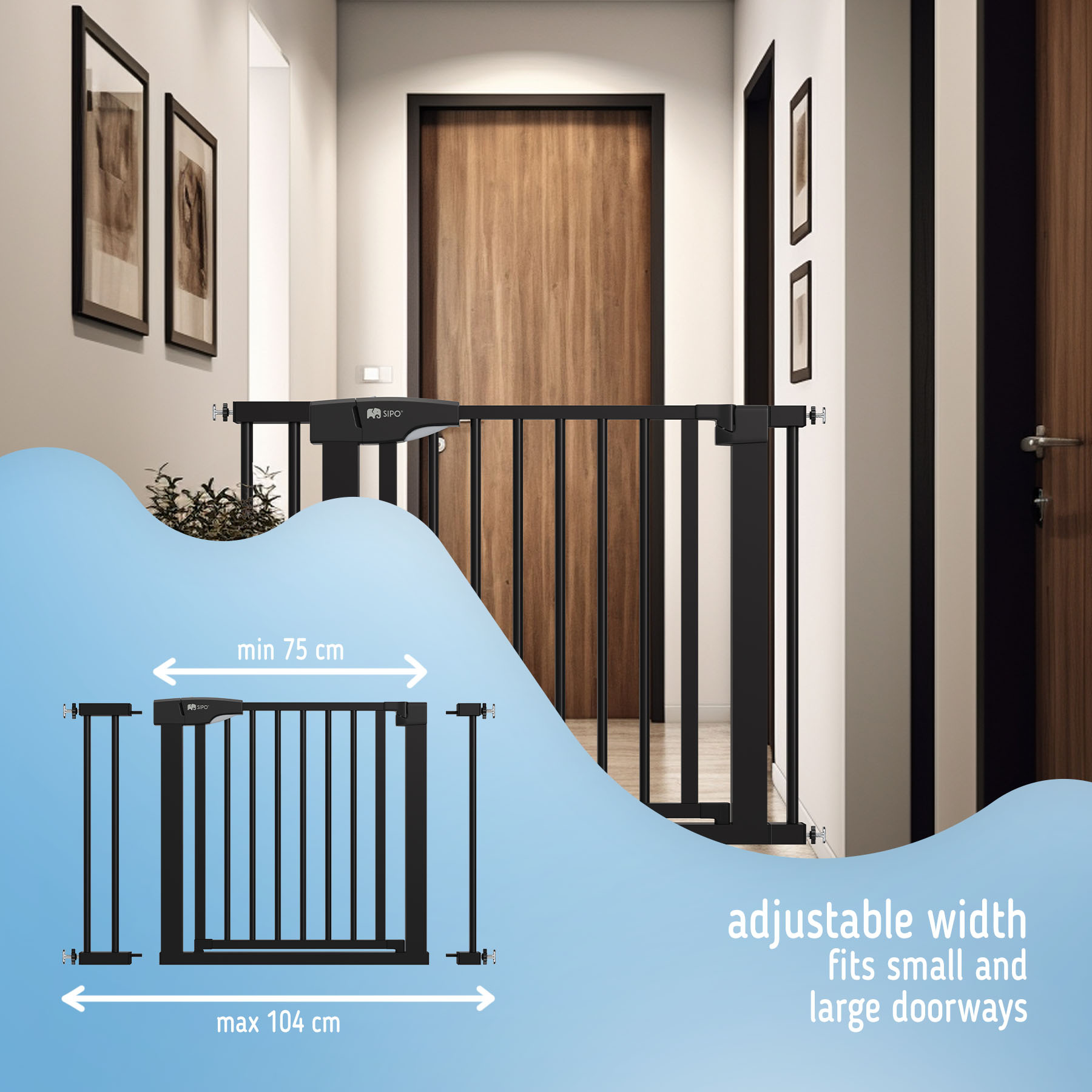 Sada skládající se z branky a kovového nástavce o šířce 7 nebo 14 cm je vhodná pro schody nebo dveře o šířce 75-103 cm. Díky nastavovacím šroubům ji můžete rychle a stabilně upevnit na místě.