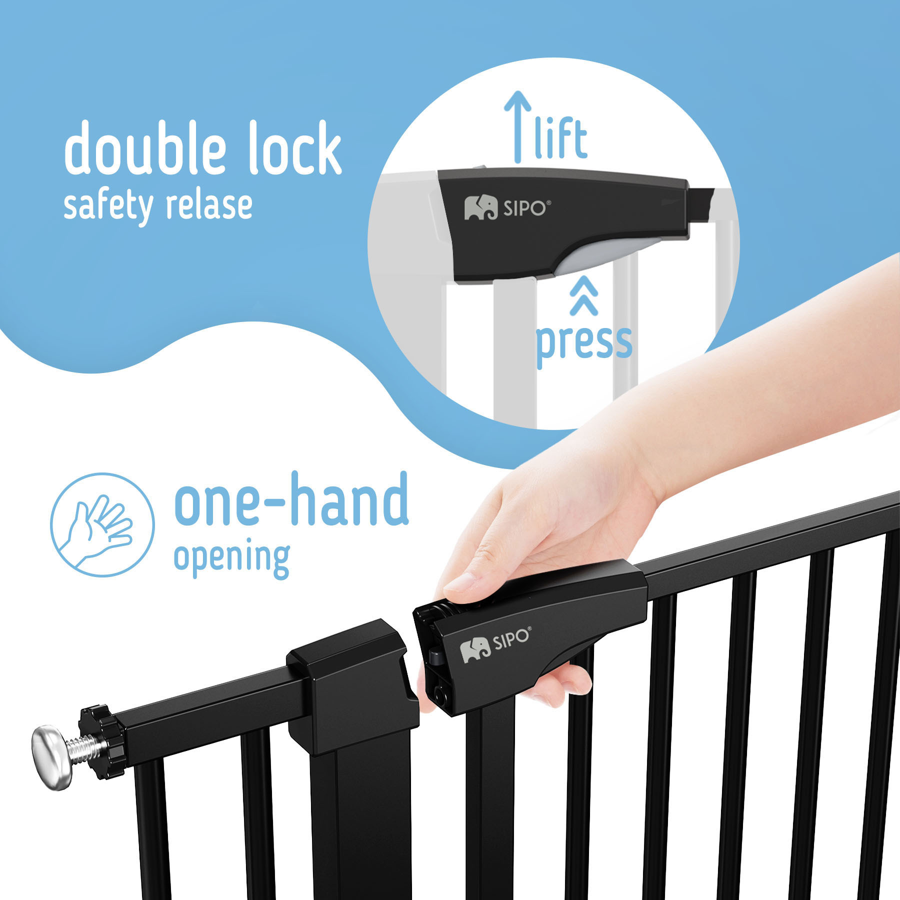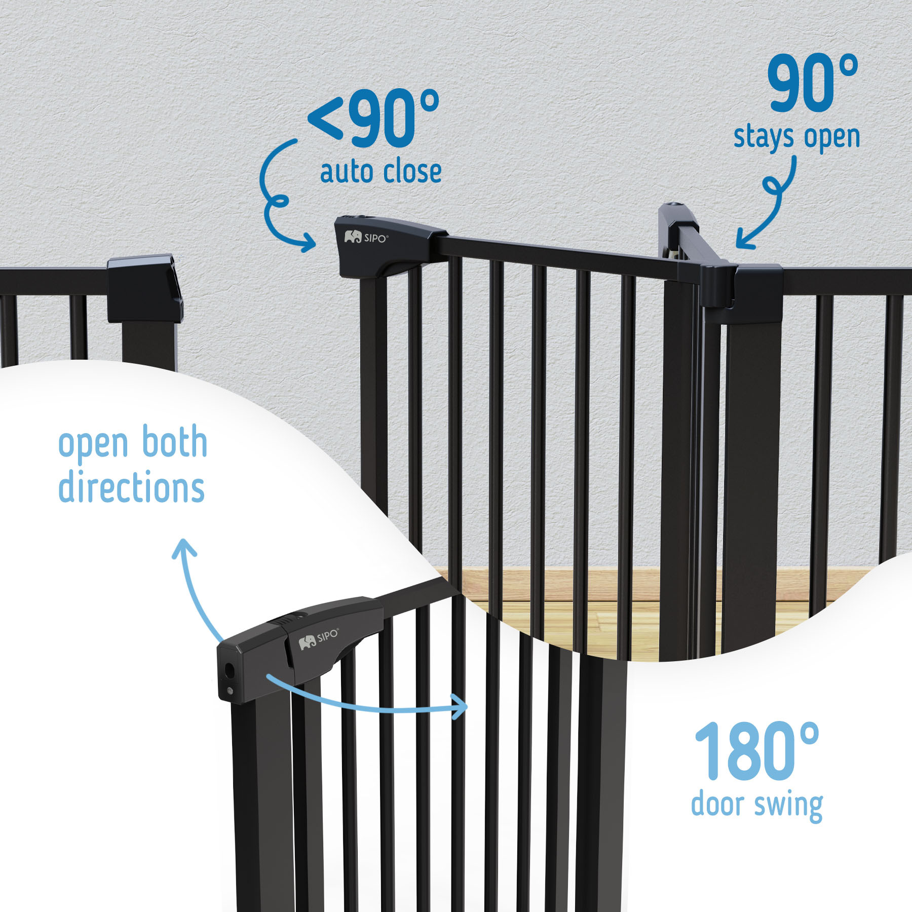 Zábranu lze snadno otevřít jednou rukou na obou stranách a po zavření se bezpečně uzamkne na místě. Zábrana nabízí úhel otevření 180° / pokud zábranu pootevřete pod úhel 90° sama se zavře, pokud ji otevřete plně - zůstane otevřená.