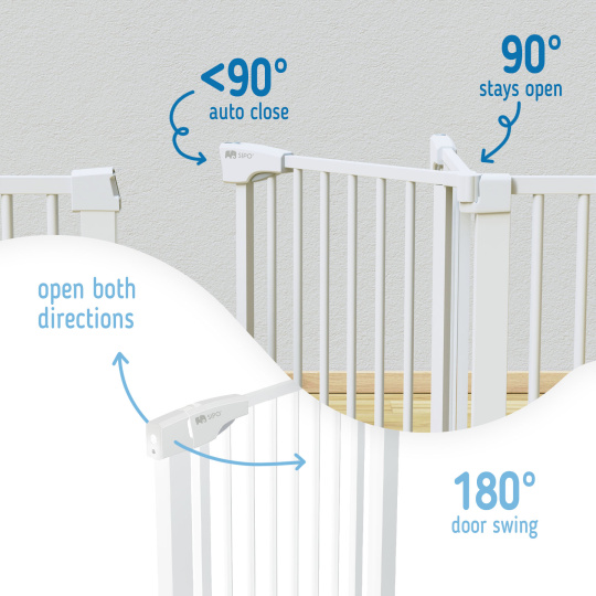 Zábranu lze snadno otevřít jednou rukou na obou stranách a po zavření se bezpečně uzamkne na místě. Zábrana nabízí úhel otevření 180° / pokud zábranu pootevřete pod úhel 90° sama se zavře, pokud ji otevřete plně - zůstane otevřená.