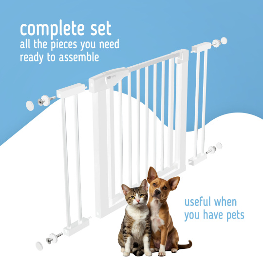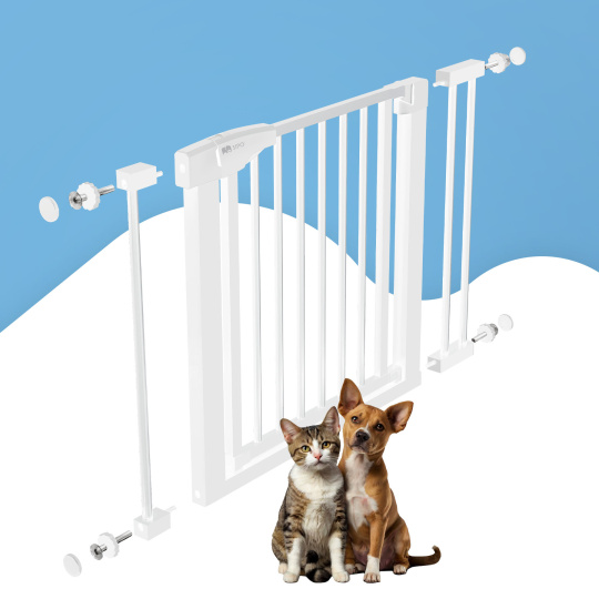 Sada skládající se z branky a kovového nástavce o šířce 7 nebo 14 cm je vhodná pro schody nebo dveře o šířce 75-103 cm. Díky nastavovacím šroubům ji můžete rychle a stabilně upevnit na místě.
