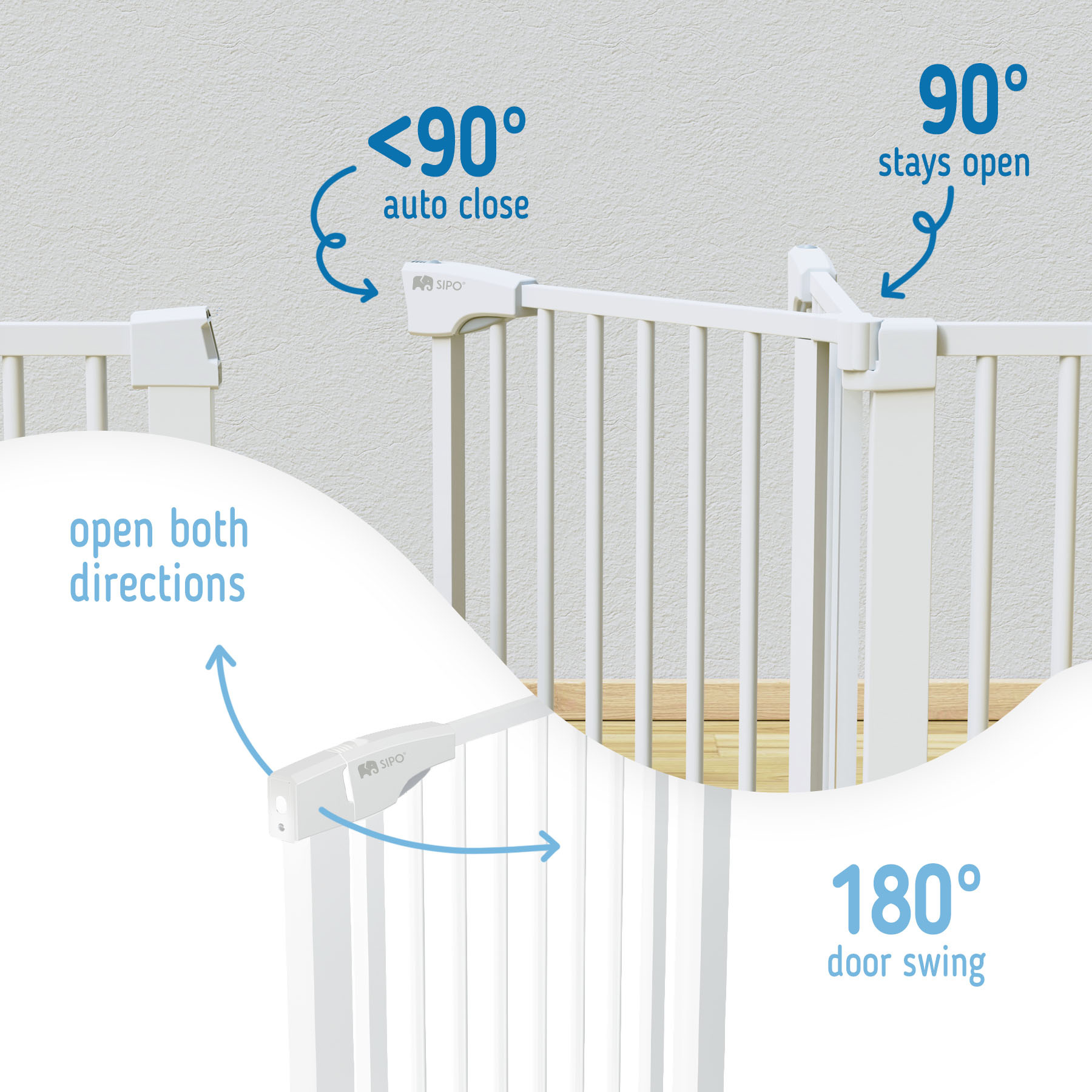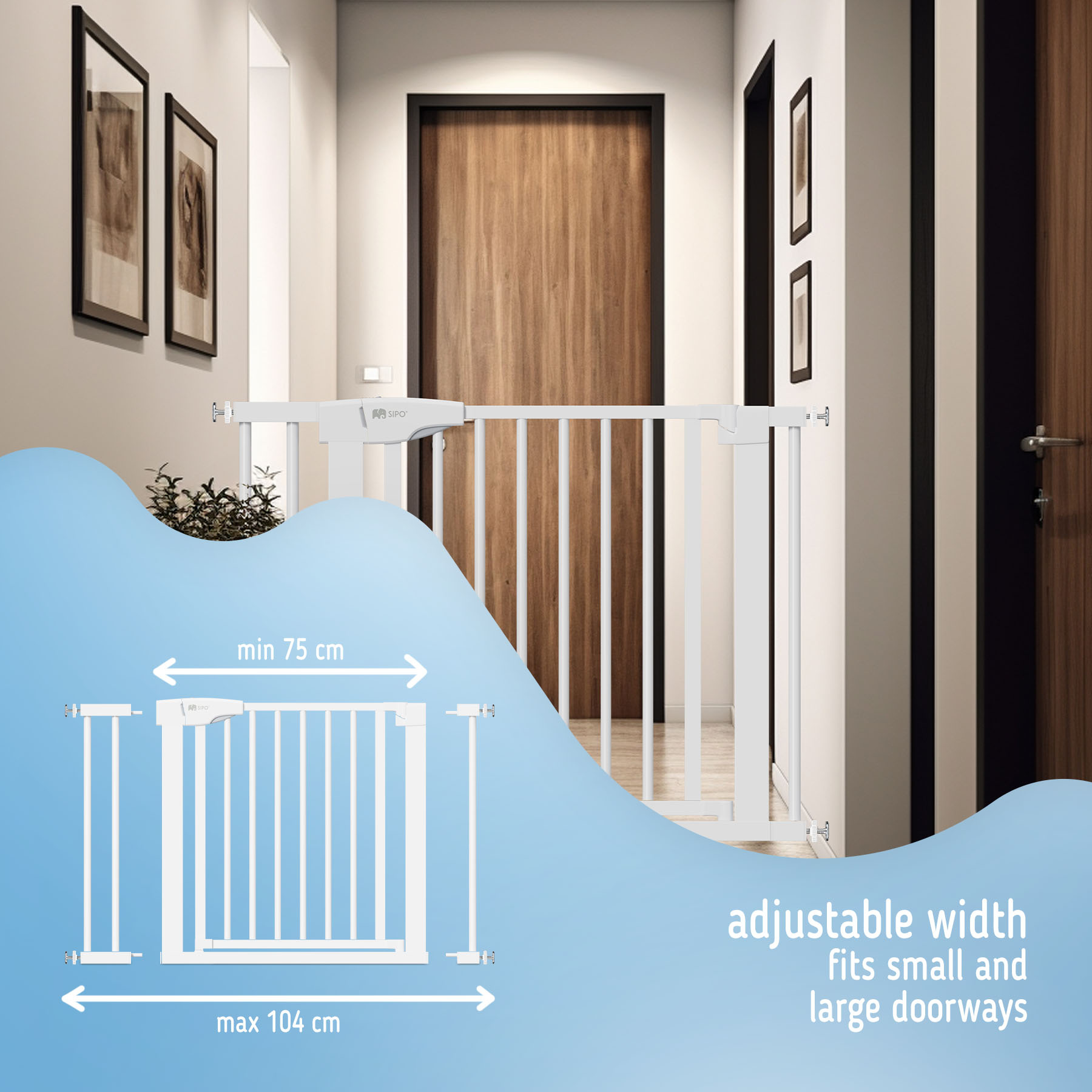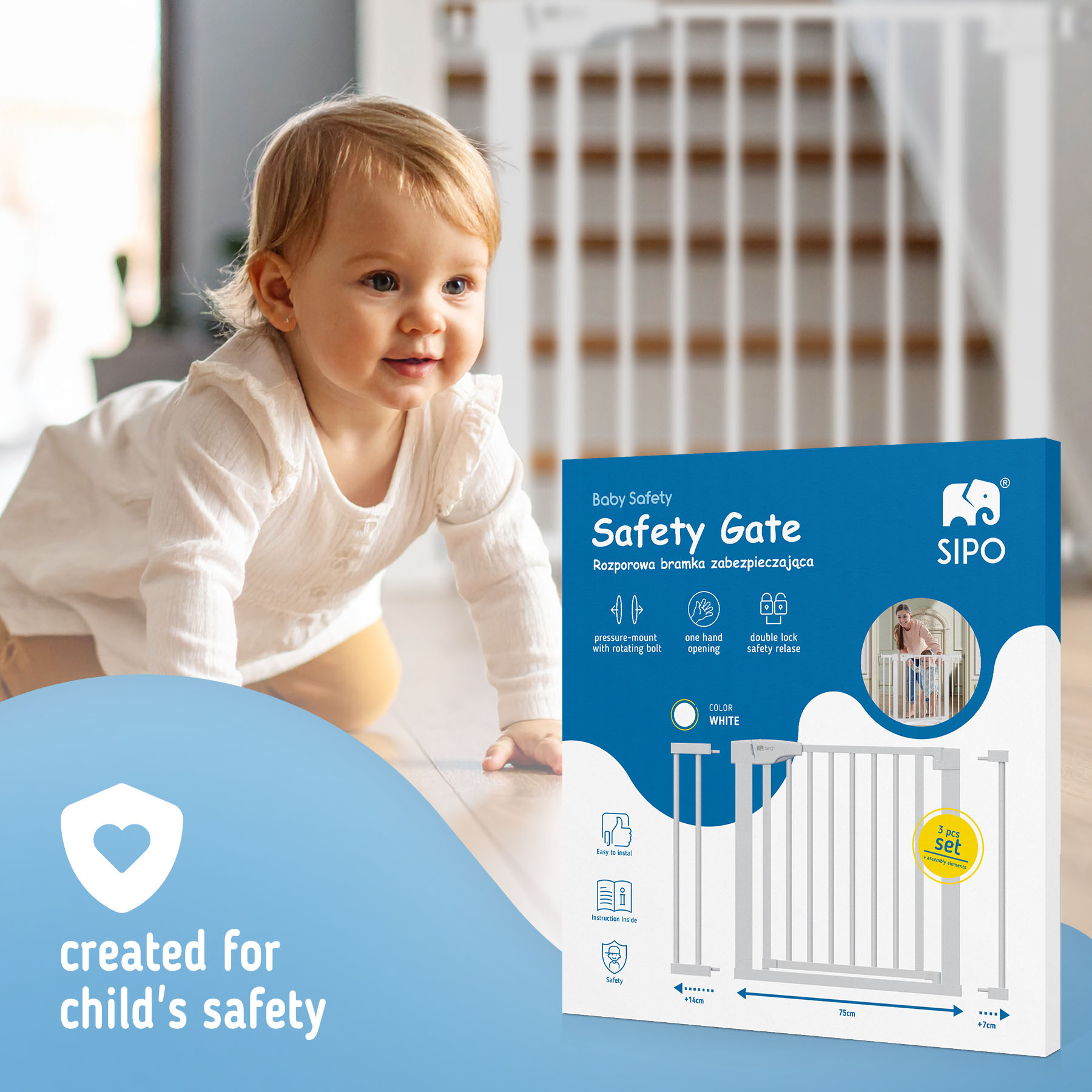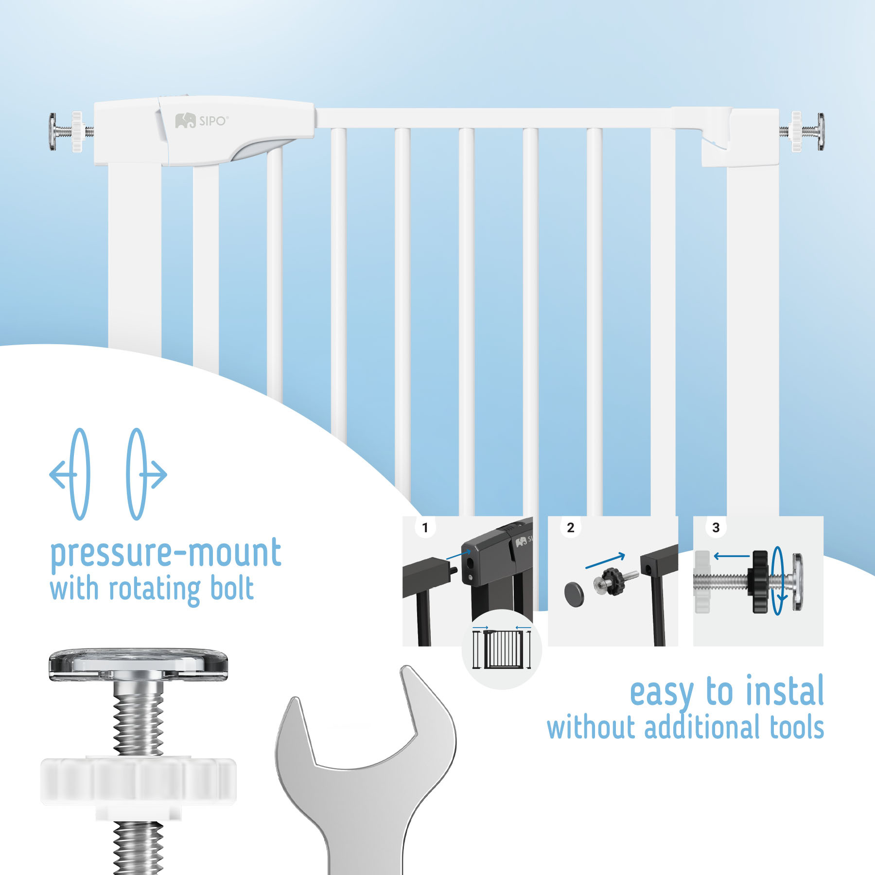 Sada skládající se z branky a kovového nástavce o šířce 7 nebo 14 cm je vhodná pro schody nebo dveře o šířce 75-103 cm. Díky nastavovacím šroubům ji můžete rychle a stabilně upevnit na místě.