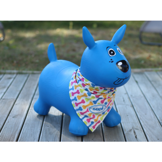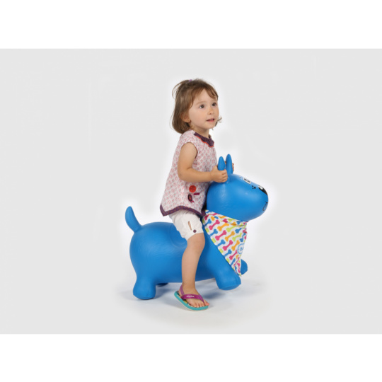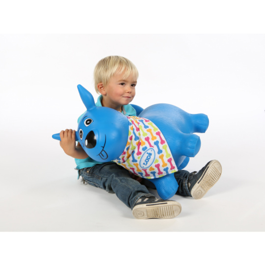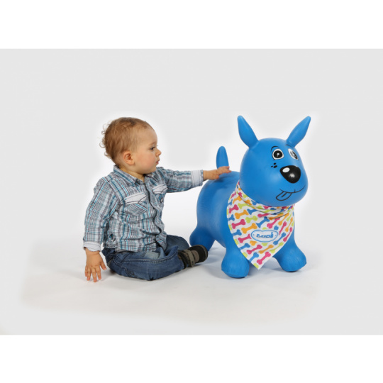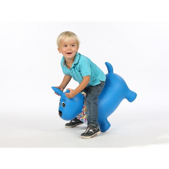 Nafukovací skákací pes pro děti ergonomického tvaru. Nejmenším dětem pomůže při jejich prvních krůčcích. Když dítě získá při chůzi jistotu, začne objevovat kouzlo skákání. Uši slouží jako držadla. Kolem krku můžete pejskovi uvázat šátek s popisovací jmenovkou, aby si dítě svého pejska mohlo pojmenovat. Vyroben z odolného materiálu vhodného pro použití doma i venku. Součástí výrobku je i nafukovací pumpička. Rozměry: 58×48×27 cm. Nosnost 35 kg. Vhodné pro děti od 10 měsíců.