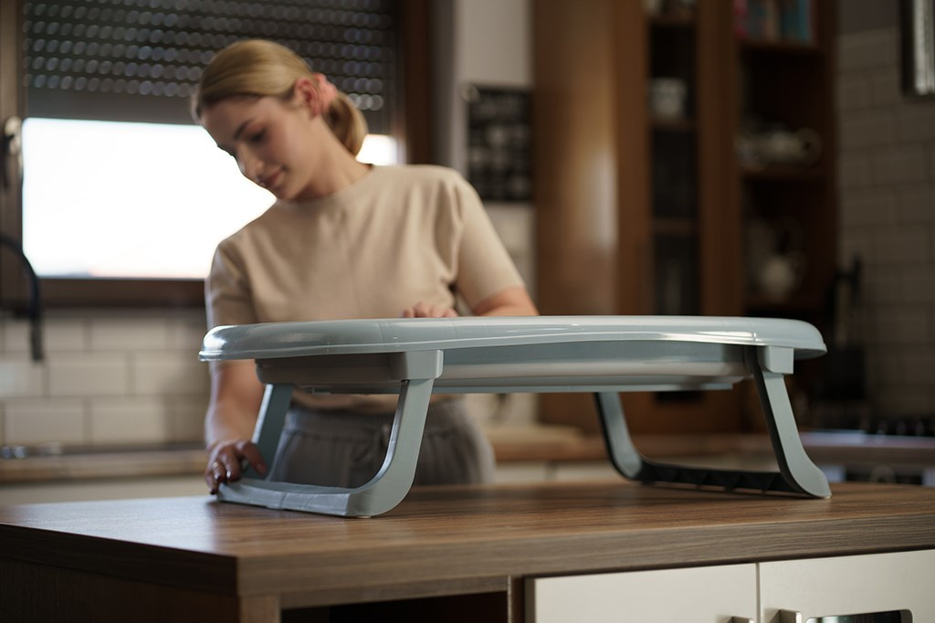 Vanička je vybavena výpustním ventilem a páskovým teploměrem, což výrazně zvyšuje komfort a bezpečnost při každodenním používání. Dá jednoduše složit na výšku pouhých 10 cm, přičemž plastové nožičky se sklopí přímo pod vaničku – díky čemuž zabírá minimum místa a je ideální pro skladování i v menších prostorách.