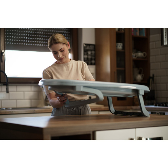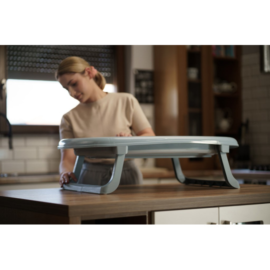 Vanička je vybavena výpustním ventilem a páskovým teploměrem, což výrazně zvyšuje komfort a bezpečnost při každodenním používání. Dá jednoduše složit na výšku pouhých 10 cm, přičemž plastové nožičky se sklopí přímo pod vaničku – díky čemuž zabírá minimum místa a je ideální pro skladování i v menších prostorách.