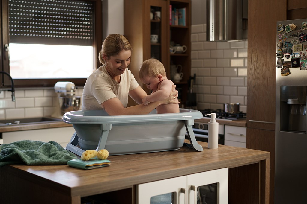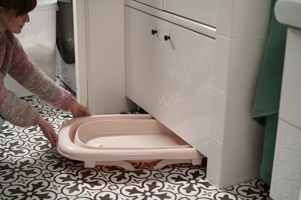 Vanička je vybavena výpustním ventilem a páskovým teploměrem, což výrazně zvyšuje komfort a bezpečnost při každodenním používání. Dá jednoduše složit na výšku pouhých 10 cm, přičemž plastové nožičky se sklopí přímo pod vaničku – díky čemuž zabírá minimum místa a je ideální pro skladování i v menších prostorách.