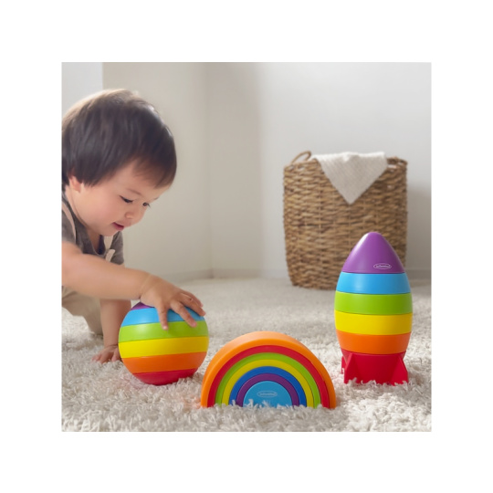 Pestrobarevná 7-dílná skládačka v podobě duhy poskytne vašemu dítěti skvělou zábavu a variabilní hru. Hračka zároveň pomáhá rozvíjet jednotlivé smysly, jemnou motoriku, koncentraci i logické myšlení dítěte. Vyrobeno z příjemného, kvalitního plastu. Rozměry složené duhy: 15 x 8 x 5,5 cm Maximální výška věže: 28,5 cm Vhodné pro děti od 12 měsíců.