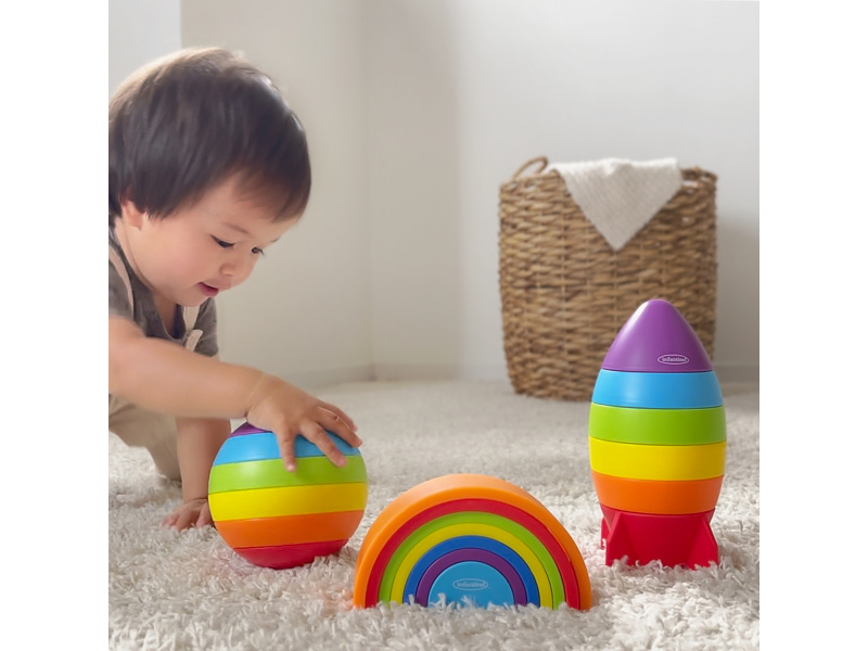 Pestrobarevná 7-dílná skládačka v podobě duhy poskytne vašemu dítěti skvělou zábavu a variabilní hru. Hračka zároveň pomáhá rozvíjet jednotlivé smysly, jemnou motoriku, koncentraci i logické myšlení dítěte. Vyrobeno z příjemného, kvalitního plastu. Rozměry složené duhy: 15 x 8 x 5,5 cm Maximální výška věže: 28,5 cm Vhodné pro děti od 12 měsíců.