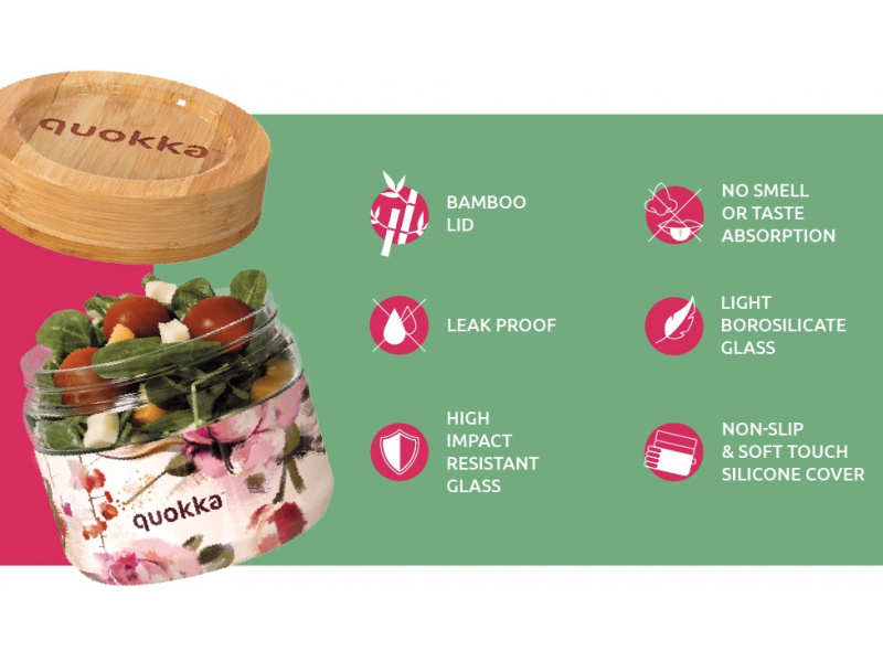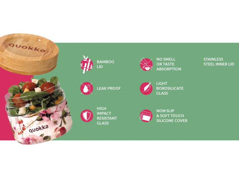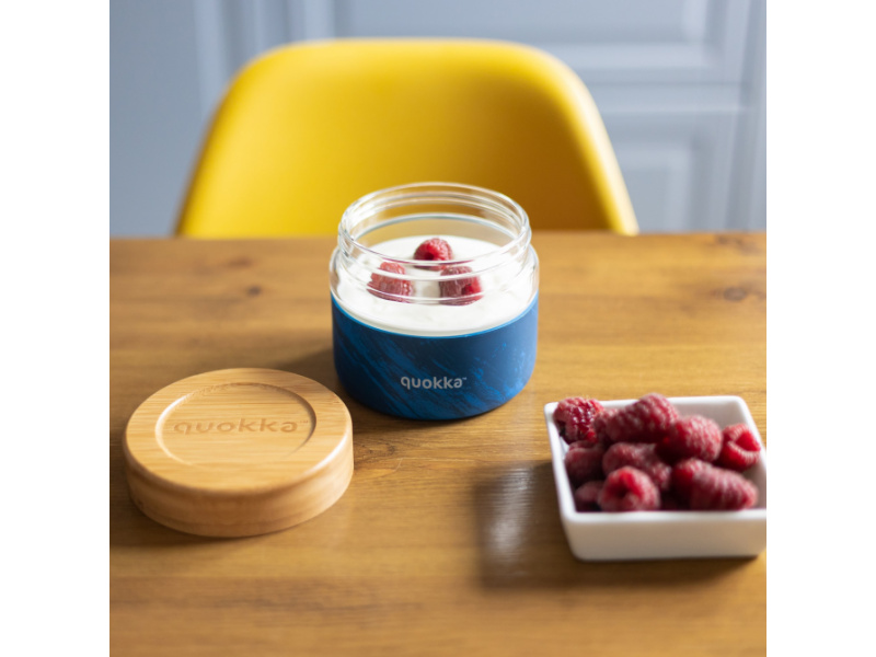 Skleněná nádoba se šroubovacím víčkem a protiskluzovým silikonovým návlekem je vhodná na přenášení svačiny do školy, do práce i na výlety. Spolehlivý, 100% těsnicí šroubovací uzávěr chrání obsah nádoby před vylitím či vysypáním. Objem: 500 ml Rozměry: 105 x 95 mm Materiál: odolné borosilikátové sklo, bambus, silikon, nerezová ocel Neobsahuje BPA. Nádoba není vhodná do myčky ani mikrovlnné trouby.