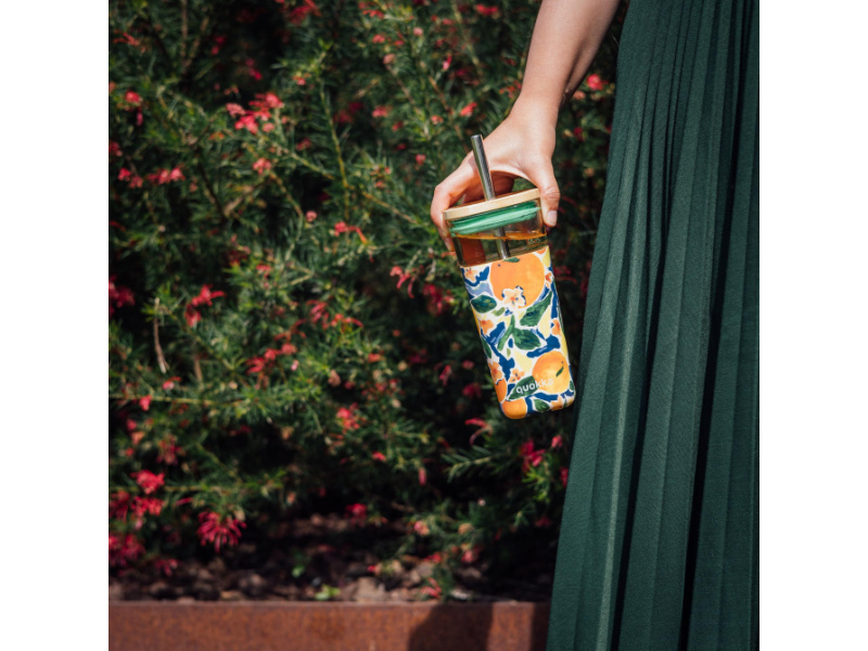 Skleněný cestovní hrnek s brčkem Liquid Cube Oranges 540 ml