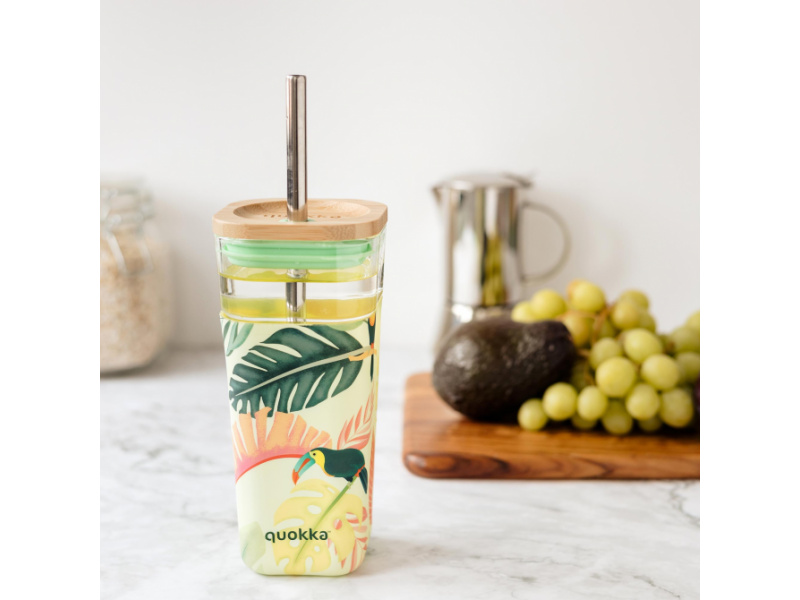 Skleněný cestovní hrnek s brčkem Liquid Cube Tropical Toucans 540 ml