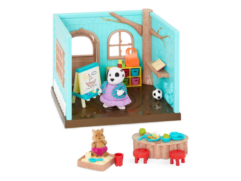 Ve školce Luvs & Hugs se děti z městečka Honeysuckle Hollow určitě nebudou nudit - zabaví se na pískovišti, malováním nebo hraním s kostkami či míčem. Když je čas na svačinku, mají na výběr z bohaté nabídky občerstvení. Součástí balení jsou dvě postavičky zvířátek - dalmatina Molly a mláděte veverky Honeybun. 41-dílná sada obsahuje školku, pískoviště, kyblík, lopatku, 2 stoličky, knihovnu, 4 police na knihy, knihu, sada kostek, stůl, malířský stojan, 3 nádoby na barvy, 3 štětce, 2 vidličky, 2 talíře, 2 misky, 2 zelená jablka, 2 mini sendviče, 2 sýry a krekry, 2 bryndáčky, fotbalový míč, 2 postavičky zvířátek (mládě veverky Honeybun a dalmatina Molly) a pohádkovou knížku v angličtině. Postavičky zvířátek Li'l Woodzeez jsou vyrobené z měkkého příjemného materiálu a mají pohyblivé ruce, nohy i hlavy pro zábavnou předstíranou hru. Každá postavička má na sobě krásné barevné oblečení. Další postavičky zvířátek, domečky, obchody, dopravní prostředky apod. se prodávají samostatně. Všechny postavičky a doplňky Li'l Woodzeez jsou navzájem kompatabilní a umožní vám vytvořit originální městečko pro nekonečnou hru rozvíjející fantazii a kreativitu vašeho dítěte. Vhodné pro děti od 3 let.