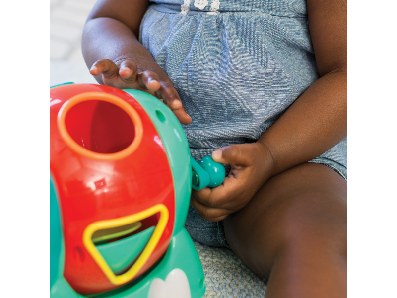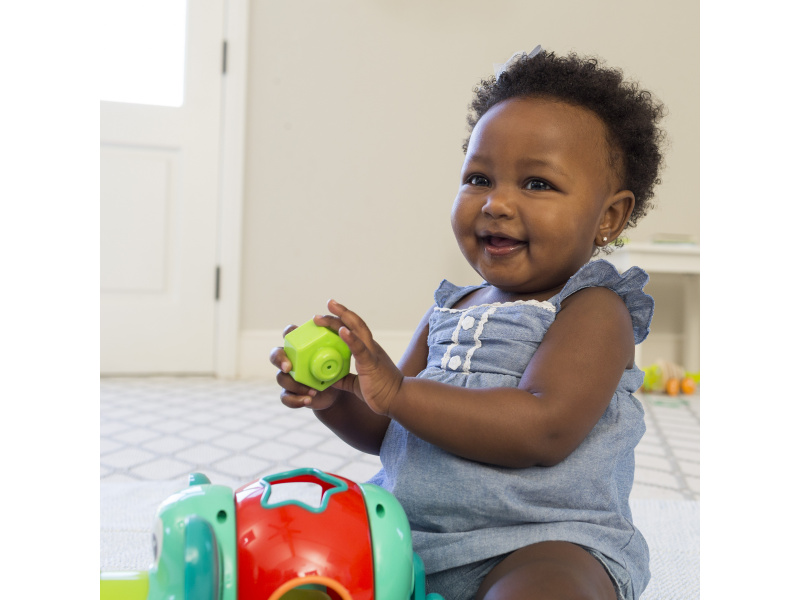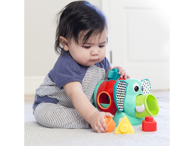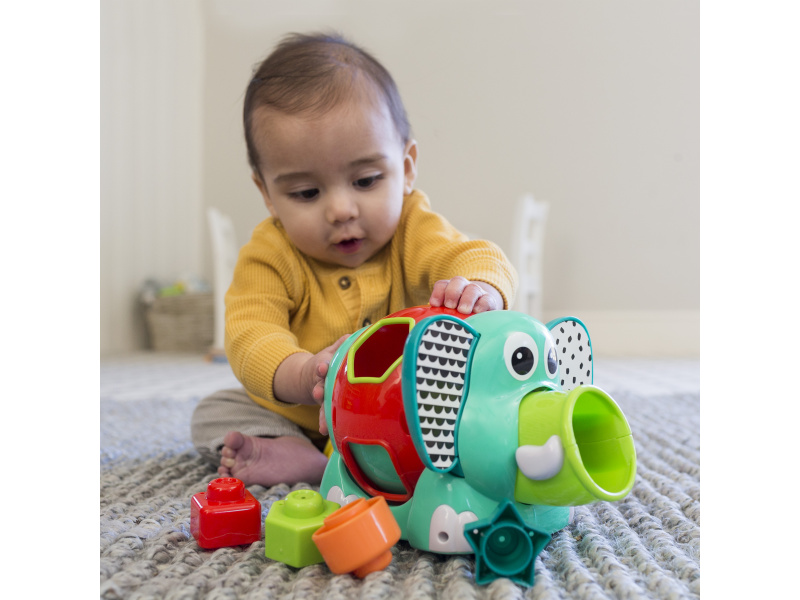 Roztomilý slon s různobarevnými vkládacími tvary. Pohyblivé uši a chobot i otočné tělo slona budou lákat dítě ke zkoumání. Hračka pomůže vašemu dítěti naučit se poznávat barvy i tvary a rozvíjet jednotlivé smysly a motorické dovednosti. Vhodné pro děti od 12 měsíců.