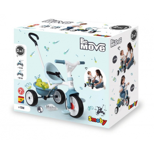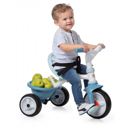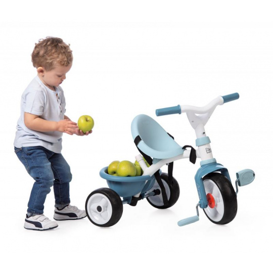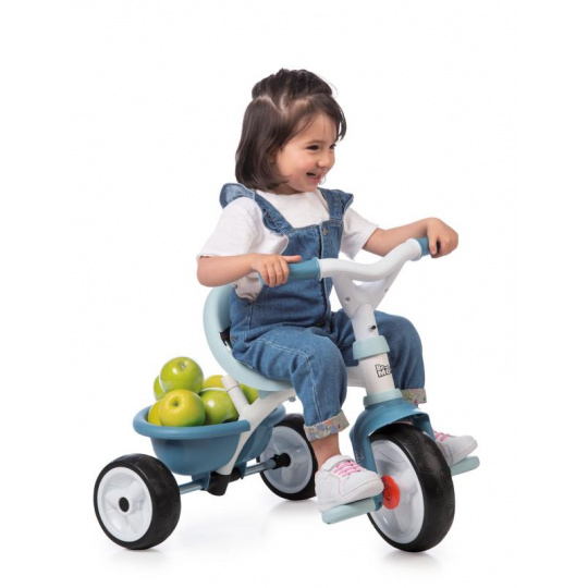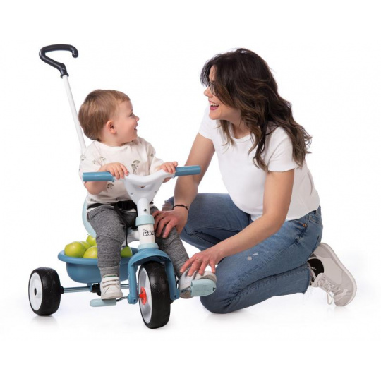 Šlapací tříkolka pro chlapečky v modré barvě má kovový rám, nastavitelnou a odnímatelnou vodící tyč (3 výškové úrovně, max. 95 cm),