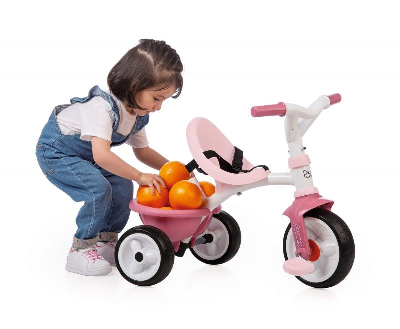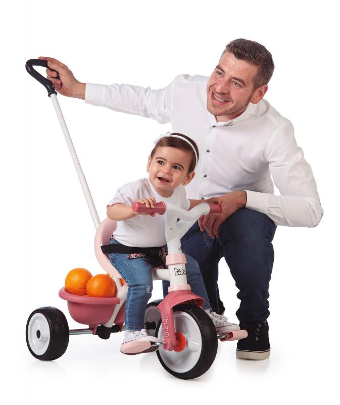 Šlapací tříkolka pro holčičky v růžové barvě má kovový rám, nastavitelnou a odnímatelnou vodící tyč (3 výškové úrovně, max. 95 cm),