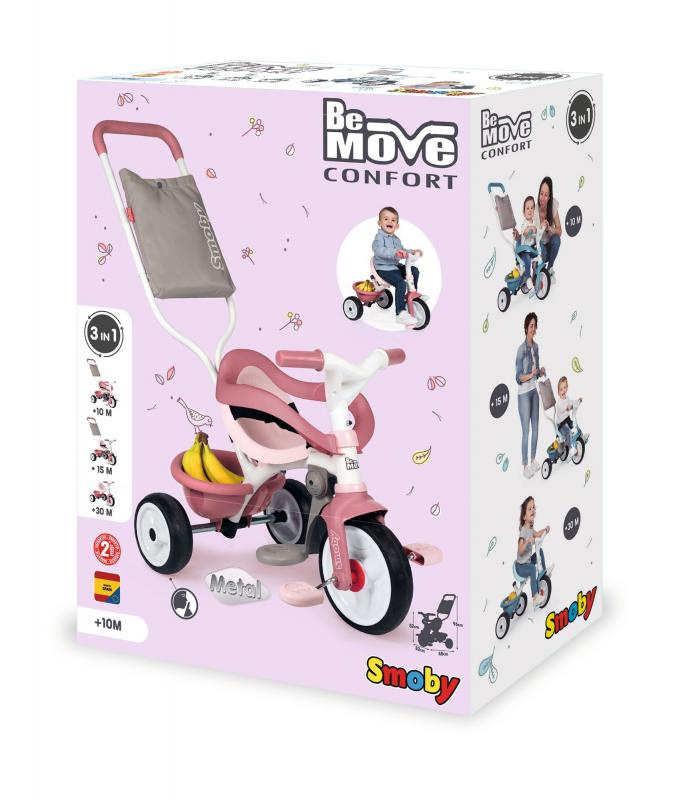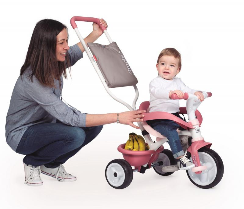 Šlapací tříkolka má kovový rám, odnímatelnou vodící tyč, bezpečnostní ochranný rám a pás, možnost zablokování šlapadel, výklopný plastový košík,
